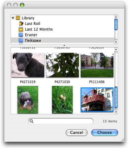 Однако для решения этой задачи можно воспользоваться довольно элегантным нересурсоемким методом, используя встроенные возможности операционной системы — с помощью Automator и AppleScript можно создать мини-браузер библиотеки iPhoto, доступный в любой момент из меню AppleScript.