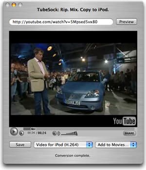 Программа Tubesock призвана решить сразу две задачи: во-первых, вы можете сохранить любое видео как просто в какой-то файл, так и сразу импортировать в iTunes (это позволит избавиться от рекламы, использовать более подходящий видеопроигрыватель, а также экономить на трафике при неоднократных просмотрах). Во-вторых, одновременно перекодировать видео в подходящий формат (например, для дальнейшего просмотра на iPod с поддержкой видео, или на Sony PlayStation Portable).