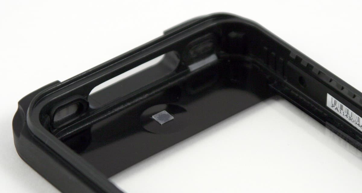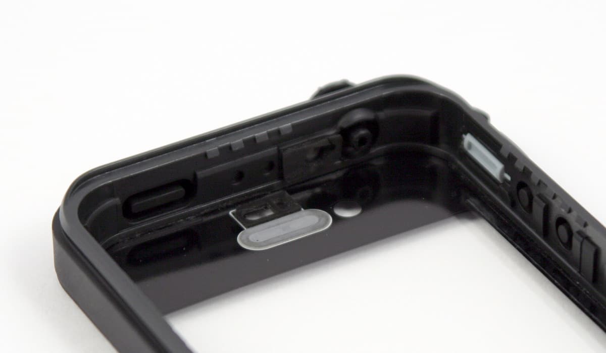 Основные элементы чехла — две половинки корпуса, изготовленные из плотного, но не жесткого пластика. Задняя панель тонкая, в ее специальном пазу по периметру находится уплотняющая прокладка. Именно она обеспечивает основную защиту от проникания воды. Во время сборки и обслуживания рекомендуется обращать особое внимание на ее состояние. На ней должны отсутствовать повреждения, грязь и пыль. Также на этой половинке находится крышка основного разъема телефона и два окошка для фотокамеры и вспышки.