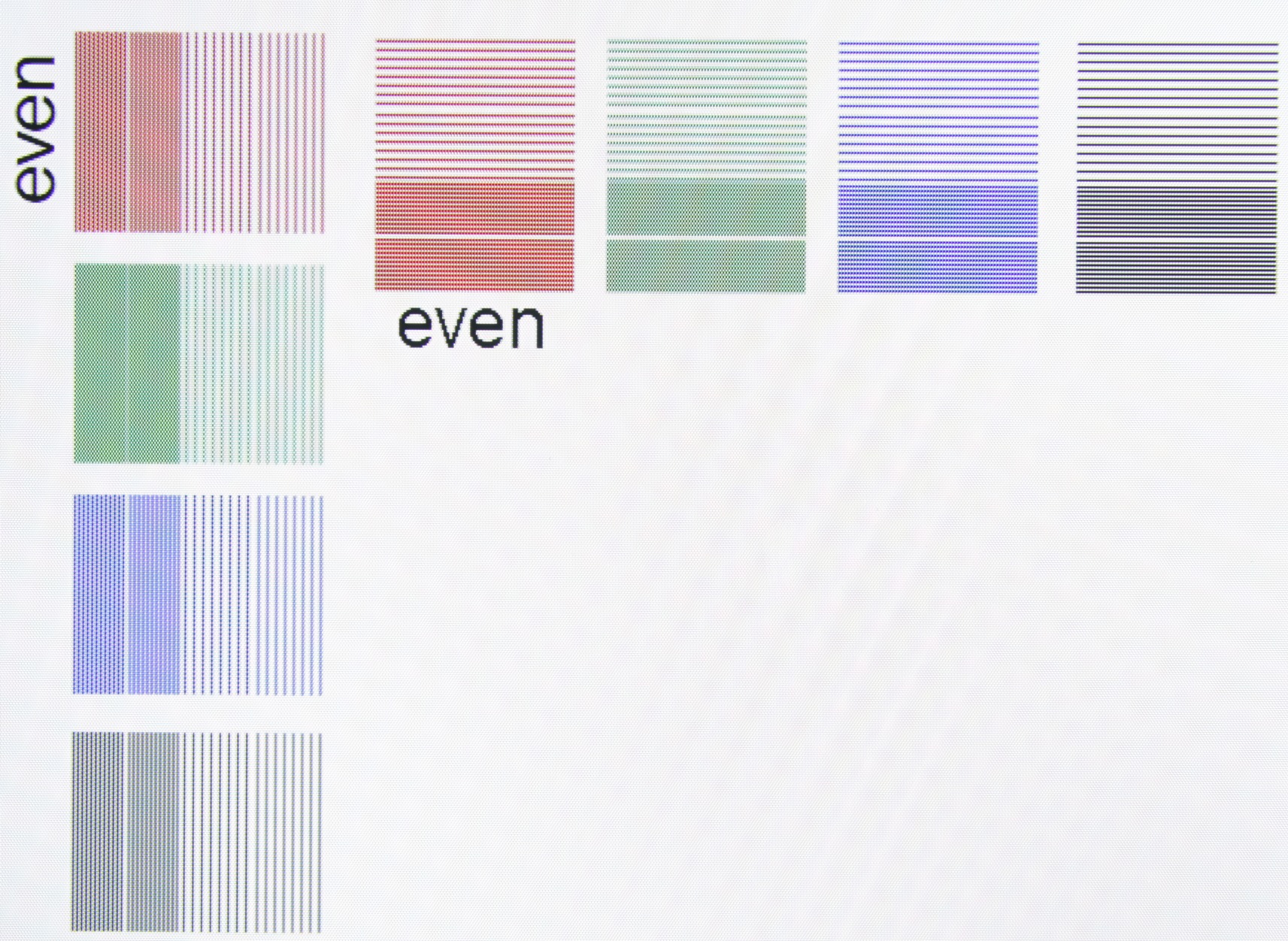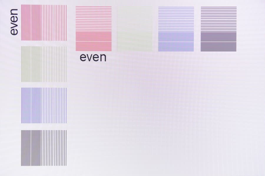 Пиксель у LG состоит из красного, зеленого, синего и белого субпикселя, у Samsung и Xiaomi — из красного, зеленого и синего субпикселя, а у Harper один пиксель — из красного, зеленого и синего субпикселя, а каждый второй пиксель — только из белого субпикселя. В итоге на том расстоянии от экрана, на котором от разрешения 4К есть польза, картинка на этом ТВ выглядит «рыхлой». Пример приведен на фотографии экрана ниже (полоски через пиксель и через два пикселя), ее лучше рассматривать в масштабе 1:1 (исходное тестовое изображение).
