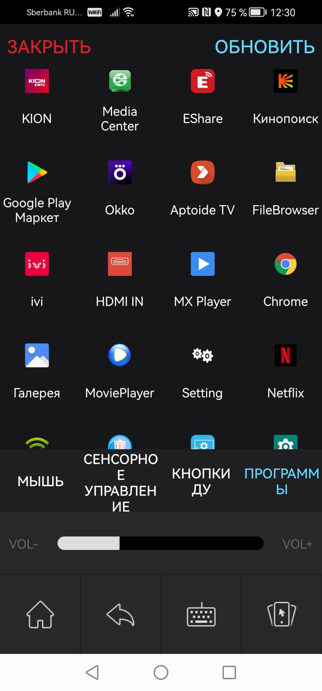 В нижней части экрана есть значки быстрого доступа к приложениям двух категорий — видео и музыка, при этом что именно будет в этих категориях, определяет сам пользователь. Выбор третьего значка в этом ряду выводит список всех установленных приложений, а четвертый отвечает за запуск встроенного файлового менеджера. В верхней части страницы размещены часы, дата и значки состояния. Если продолжить прокрутку страницы вверх, то появляются значки доступа к режимам EShare, Miracast и Airplay, переключения на вход HDMI, выбора фонового изображения для Главного экрана и входа в меню с базовыми настройками из которого можно перейти с списку с другими настройками.