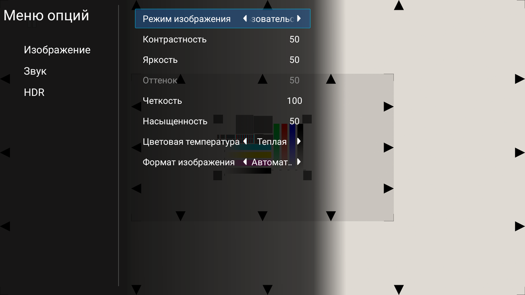 В программах меню с настройками изображения и звука появляется при нажатии на клавишу F3 на клавиатуре, ее аналога на пульте ДУ мы не нашли.