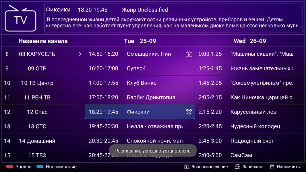 Есть хорошая поддержка электронной программы передач — можно посмотреть, что именно идет на текущем и других каналах, запрограммировать просмотр или запись программы или сериала и т. д.