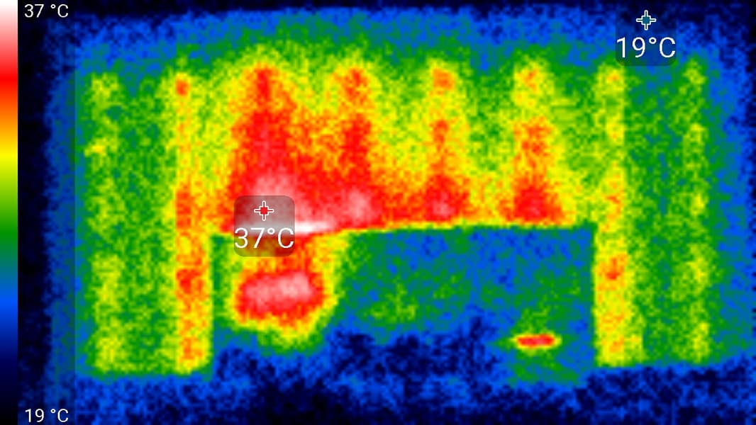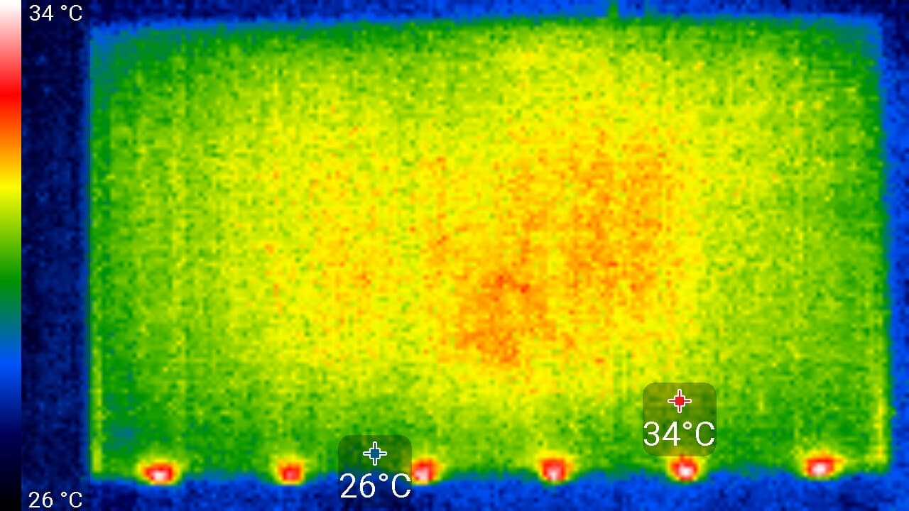 Видно, что основным источником тепла является центральная область экрана и 6 точек внизу под рамкой. По всей видимости, в данном телевизоре используется не краевая, а задняя подсветка, не поделенная на независимо управляемые зоны.