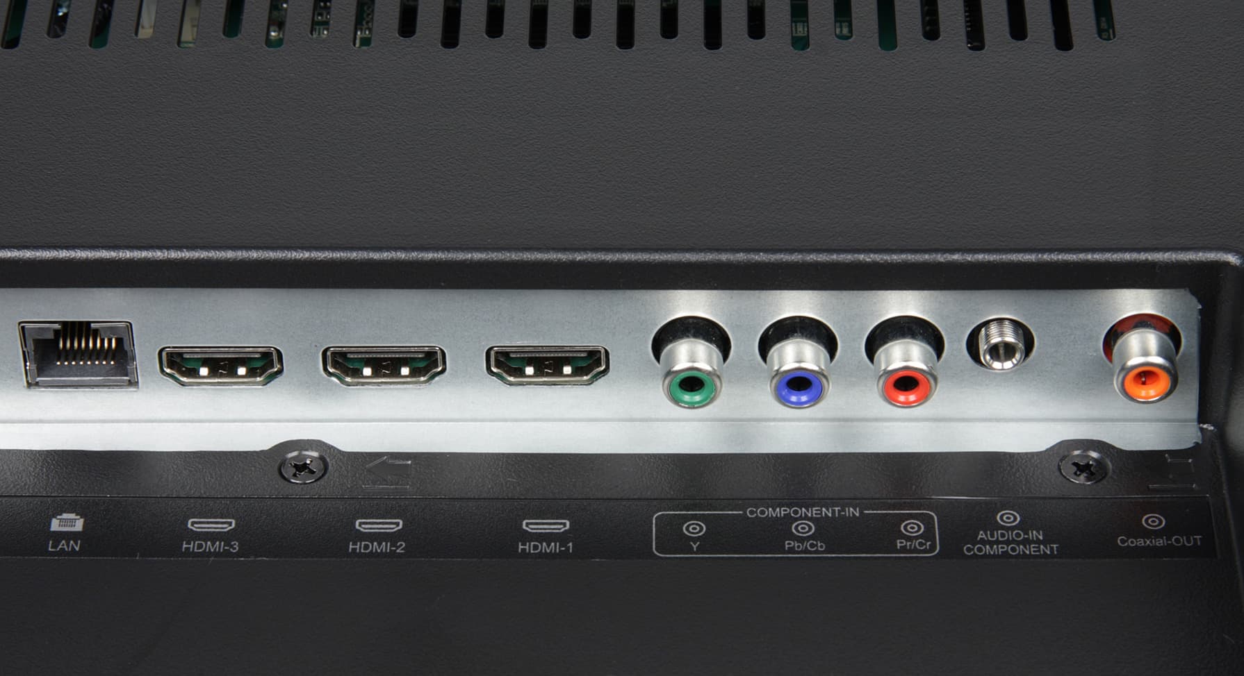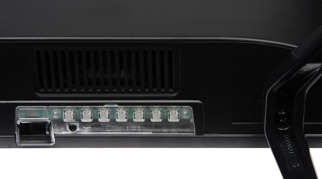 Разъемы размещены на двух торцах выступающего назад пластикового кожуха. Часть разъемов направлена вниз, часть вбок, назад ничего не торчит, что хорошо. Спереди дотягиваться до разъемов, например, до разъема для наушников непросто. Кабель питания неотсоединяемый. Таблица с характеристиками в начале статьи дает представление о коммуникационных возможностях телевизора. Большинство разъемов стандартные, полноразмерные и размещены более-менее свободно. Претензии можно предъявить к тесно расположенным входам USB и к аудиовходу для компонентного видеовхода в виде разъема миниджек 3,5 мм на 3 контакта. Но производитель приложил переходник на более привычные RCA.
