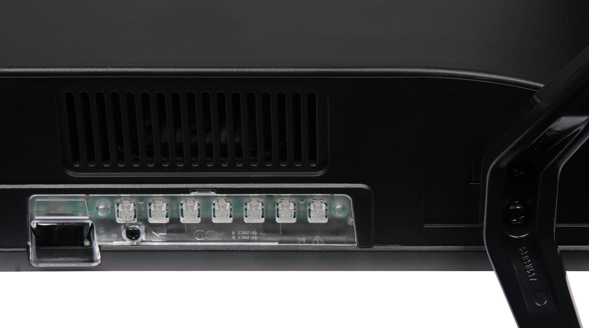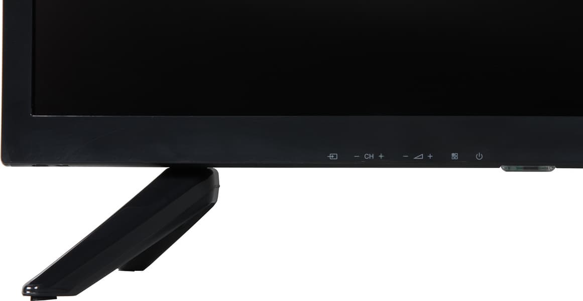 На нижнем торце слева есть накладка из прозрачного пластика. Она прикрывает ИК-приемник пульта ДУ, индикатор состояния и целых 7 кнопок, с помощью которых можно ограниченно управлять телевизором без помощи пульта ДУ.