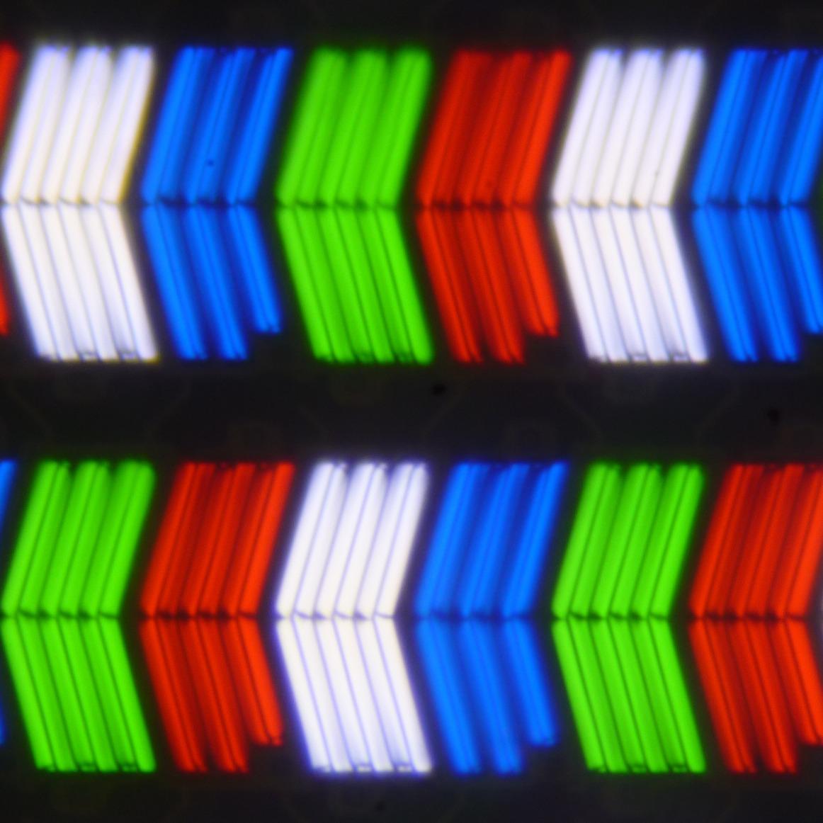Обнаружилась причина, почему мира с вертикальными полосками через пиксель была слегка «рыхлая»: один из трех цветных субпикселей заменен на белый. Устройства изображения, в которых применяются белые (или желтые) субпиксели — не очень большая редкость. Есть ли от них польза? Производители заявляют, что есть, нам ее обнаружить не удавалось. Отметим, что никакого видимого «кристаллического» эффекта (микроскопической вариации яркости и оттенка) в данном случае нет.