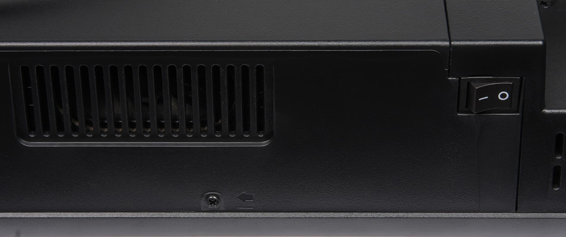 В дежурном режиме индикатор неярко горит синим, а в рабочем — не светится. Далеко от фронтальной плоскости на нижнем торце правее центра находится механический выключатель, полностью отключающий телевизор от питания.