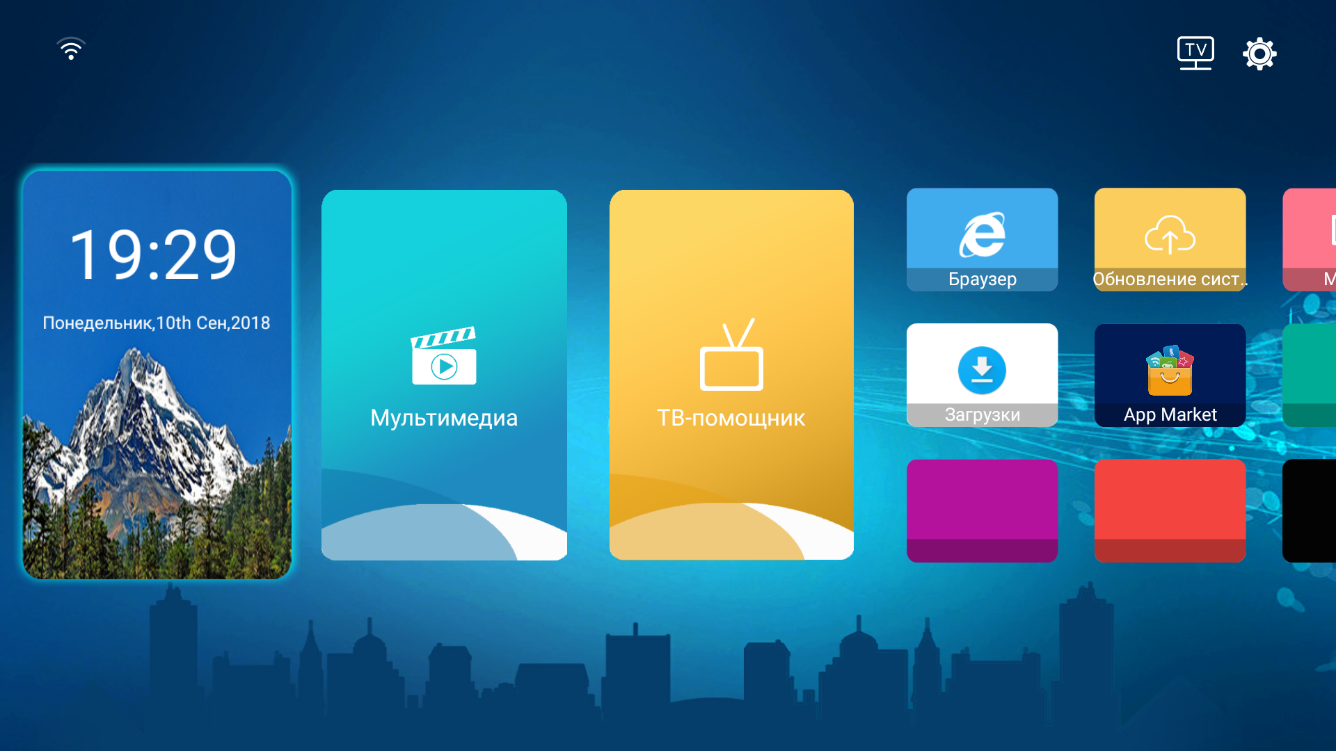 Программной платформой для этого ТВ служит операционная система Android TV версии 6.0. Используется оригинальная программная оболочка и ряд предустановленных приложений, оформленных в едином стиле. Однако местами проглядывает стандартный интерфейс Android TV (например, в меню настроек системы и в окнах системных сообщений), также пользователю никто не мешает поставить нужное приложение из Google Play (только для Android TV), специализированного магазина App Market или из файла APK. Последний способ наиболее универсальный и рекомендуется, так как в двух указанных магазинах выбор приложений ограничен. На заглавной странице интерфейса расположены три больших прямоугольника со скругленными углами (один информационный и два для запуска двух встроенных приложений) и девять поменьше, ссылающихся на приложения. Приложения, на которые ссылаются небольшие прямоугольники пользователь может выбрать на свой вкус из установленных.