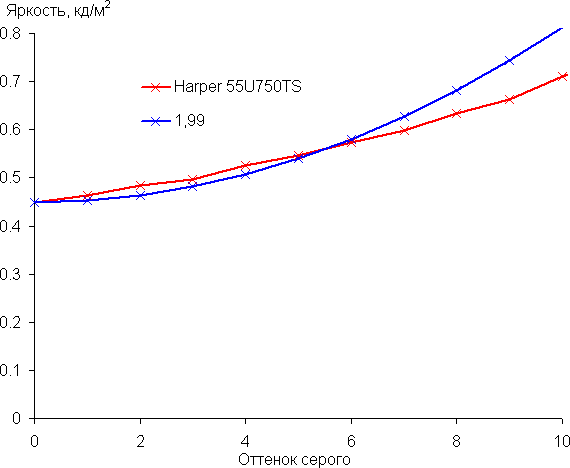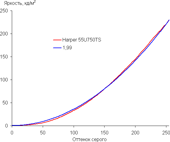 Аппроксимация полученной гамма-кривой дала показатель 1,99, что ниже стандартного значения 2,2, при этом реальная гамма-кривая заметно отклоняется от аппроксимирующей степенной функции: