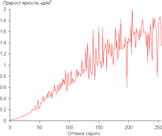 Для оценки характера роста яркости мы измерили яркость 256 оттенков серого (от 0, 0, 0 до 255, 255, 255) при подключении к ПК по HDMI в режиме RGB. График ниже показывает прирост (не абсолютное значение!) яркости между соседними полутонами: