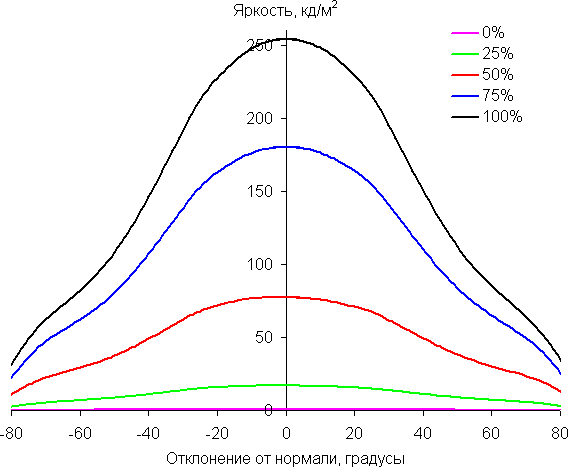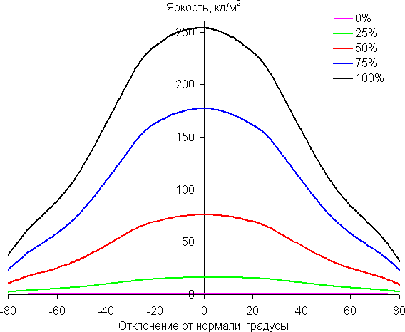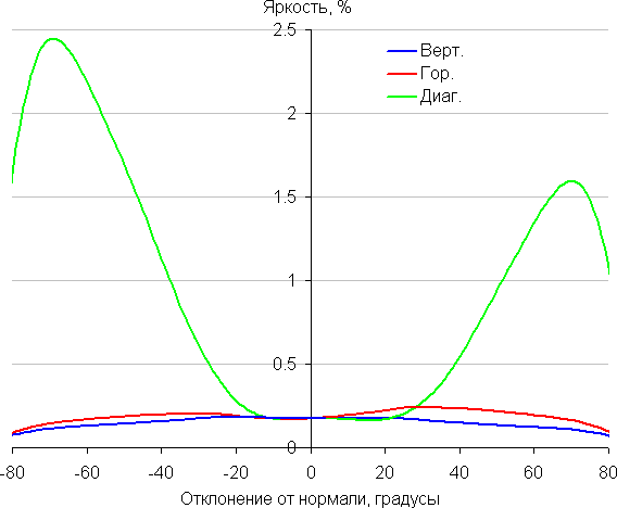 Отметим плавное уменьшение яркости при отклонении от перпендикуляра к экрану во всех трех направлениях, при этом графики яркости полутонов не пересекаются во всем диапазоне измеряемых углов. При отклонении в диагональном направлении поведение яркости оттенков имеет промежуточный характер между вертикальным и горизонтальным направлениями, за исключением яркости черного поля, которая начинает резко возрастать уже при 30° отклонения от перпендикуляра к экрану. Если сидеть от экрана на расстоянии 1,5 м, то черное поле по углам будет заметно светлее, чем в центре. Контрастность в диапазоне углов ±82° для двух направлений значительно превышает 10:1 и только для диагонального направления она ниже и по одной диагонали опускается за отметку 10:1 при 70°.