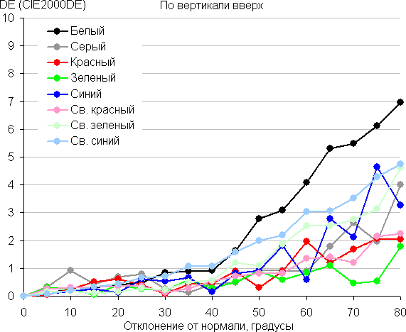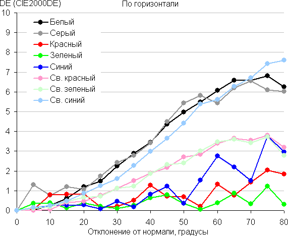 Для количественной характеристики изменения цветопередачи мы провели колориметрические измерения для белого, серого (127, 127, 127), красного, зеленого и синего, а также светло-красного, светло-зеленого и светло-синего полей во весь экран с использованием установки, подобной той, что применялась в предыдущем тесте. Измерения проводились в диапазоне углов от 0° (датчик направлен перпендикулярно к экрану) до 80° с шагом в 5°. Полученные значения интенсивностей были пересчитаны в отклонение ΔE относительно замера каждого поля при перпендикулярном положении датчика относительно экрана. Результаты представлены ниже: