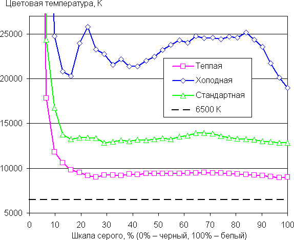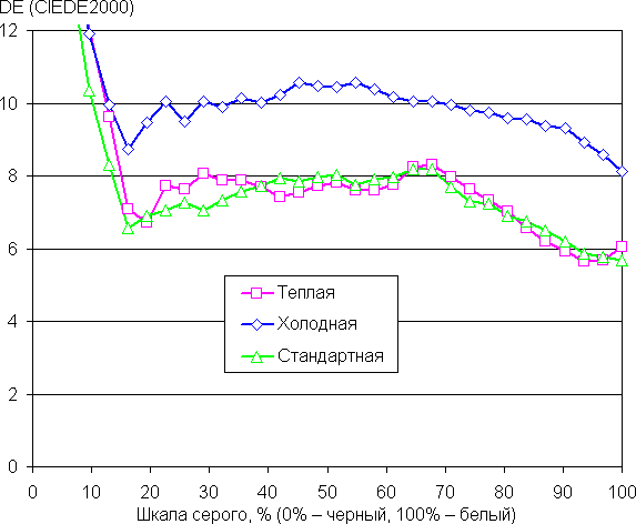 Графики ниже показывают цветовую температуру на различных участках шкалы серого и отклонение от спектра абсолютно черного тела (параметр ΔE) для трех встроенных профилей цветовой температуры: