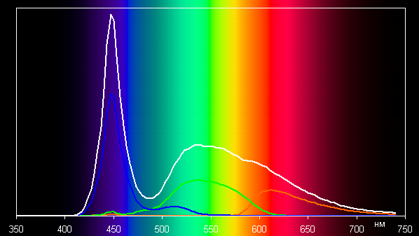 Ниже приведен спектр для белого поля (белая линия), наложенный на спектры красного, зеленого и синего полей (линии соответствующих цветов):