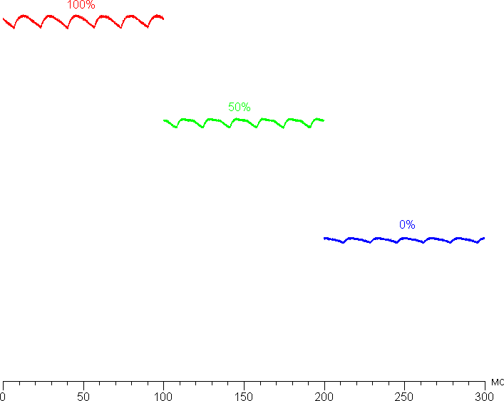 На любом уровне яркости значимая модуляция подсветки отсутствует, поэтому нет и никакого мерцания экрана. В доказательство приведем графики зависимости яркости (вертикальная ось) от времени (горизонтальная ось) при различных значениях настройки Подсветка: