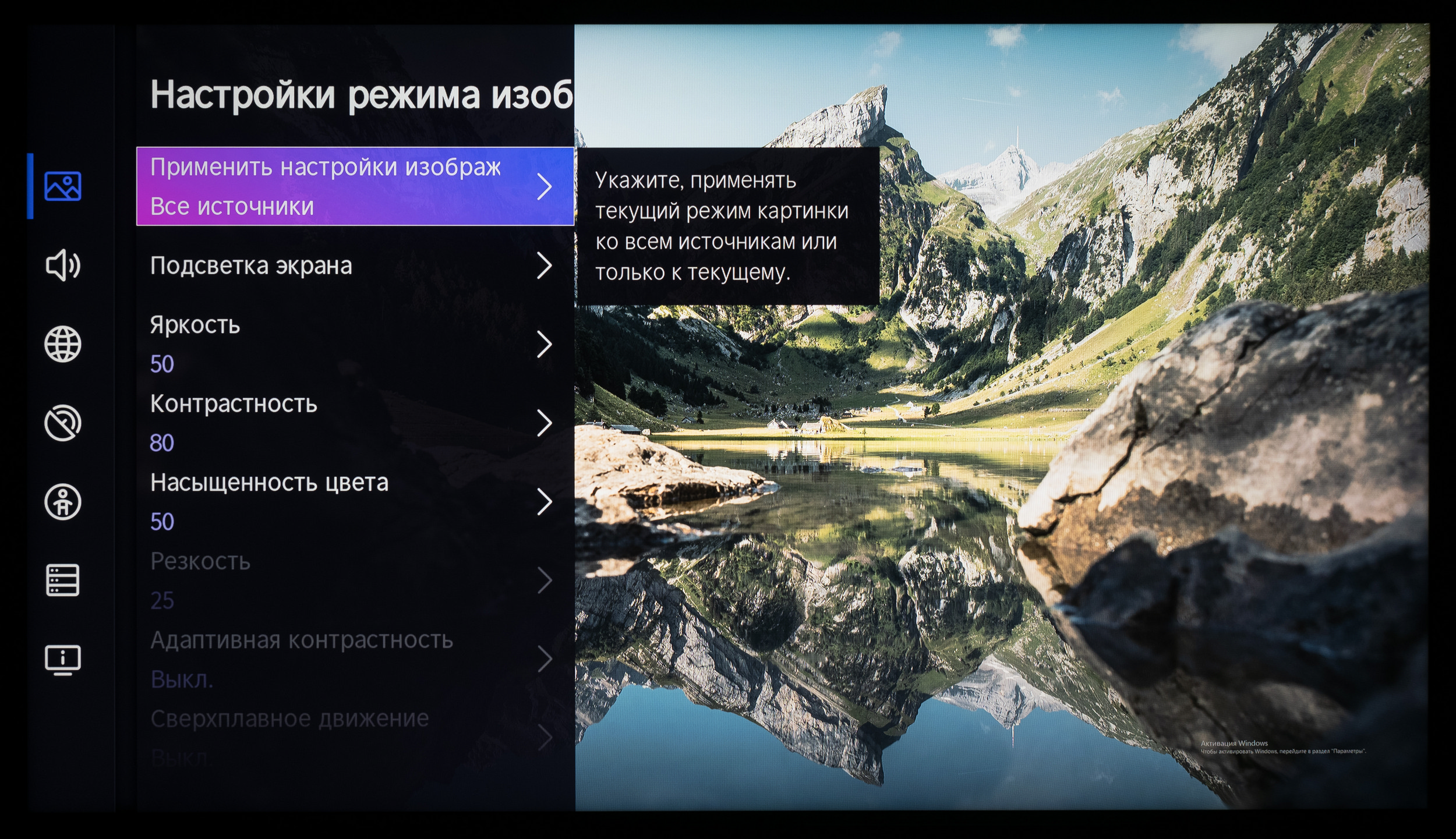 Непосредственно при регулировке параметров изображения на экран выводится уже только название настройки, ползунок и текущее значение или список вариантов, что облегчает оценку влияния этой настройки на изображение, при этом настройки с ползунками перебираются стрелками вверх и вниз (но в некоторых случаях данная возможность оказывается недоступной). Это привычная и крайне удобная система взаимодействия с ТВ при его настройке — как и в моделях большинства других брендов.
