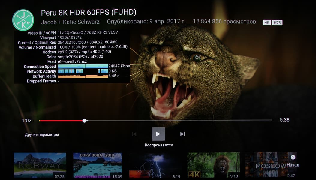 Максимальный битрейт видеофайлов, при котором еще не было артефактов, при воспроизведении с USB-носителей и по Wi-Fi (5 ГГц) составил как минимум 120 Мбит/с (не было тестовых файлов с большим битрейтом), а по проводной сети Ethernet — как минимум 90 Мбит/с (файл с битрейтом 120 Мбит/с уже не воспроизводился). В двух последних случаях использовался медиасервер роутера Asus RT-AC68U. Статистика на роутере показывает, что скорость приема и передачи составляет 866,7 Мбит/с, то есть в телевизоре действительно установлен адаптер 802.11ac. Кстати, в приложении YouTube удалось посмотреть видео в разрешении 4K с HDR и даже с 60 кадр/с.