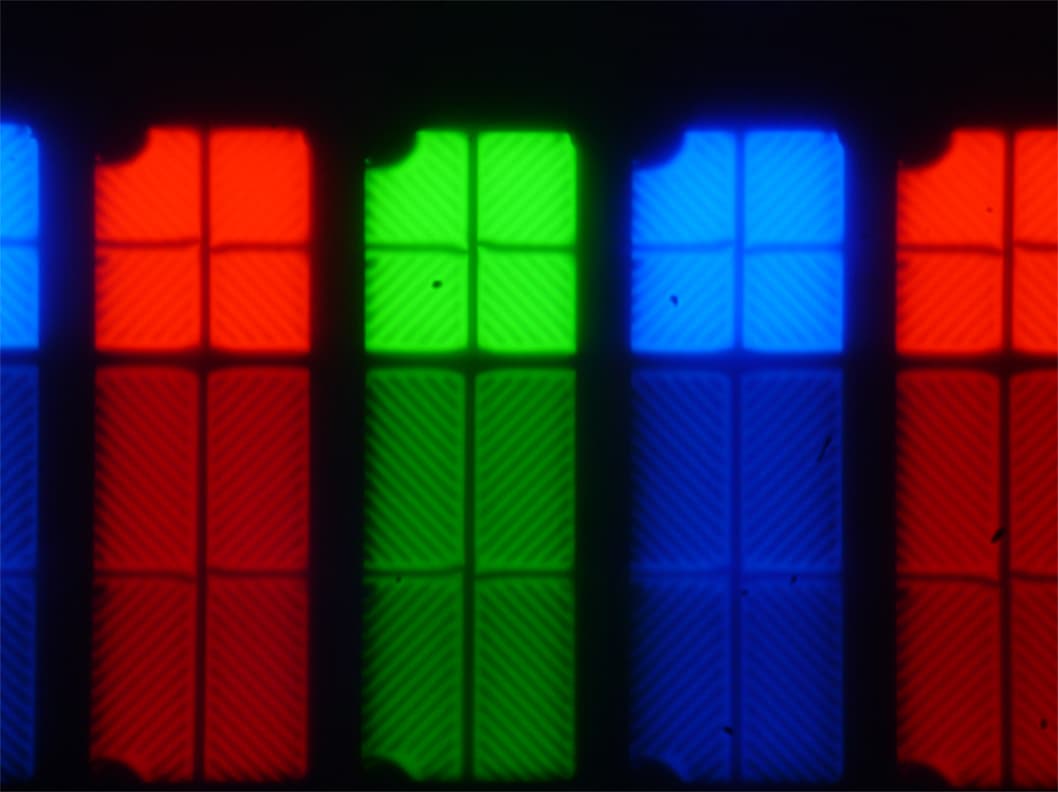 Субпиксели трех цветов (красного, зеленого и синего) поделены на две различающиеся по площади и независимо управляемые области, каждая из которых разделена на четыре участка с доменами в различающейся ориентации. Такое сложное устройство в принципе способно обеспечить широкий динамический диапазон по количеству оттенков, так как с ростом яркости области включаются последовательно, и хорошие углы обзора, чему способствует вариация ориентации ЖК в доменах. Отметим, что никакого «кристаллического эффекта» (микроскопической вариации яркости и оттенка) в данном случае нет.