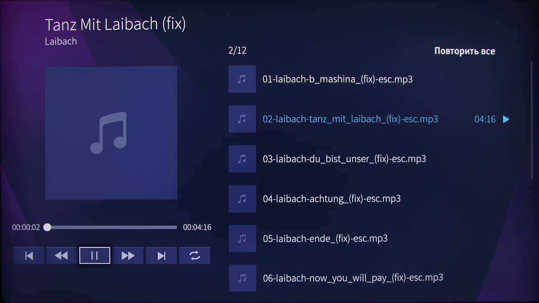В случае аудиофайлов поддерживаются множество распространенных и не очень форматов, как минимум AAC, MP3, MP4, OGG, WMA (и с 24 бит), M4A, WAV и FLAC (расширение должно быть именно FLAC). Поддерживаются тэги как минимум в MP3 и WMA (русские должны быть в Unicode) и картинки-обложки в MP3.
