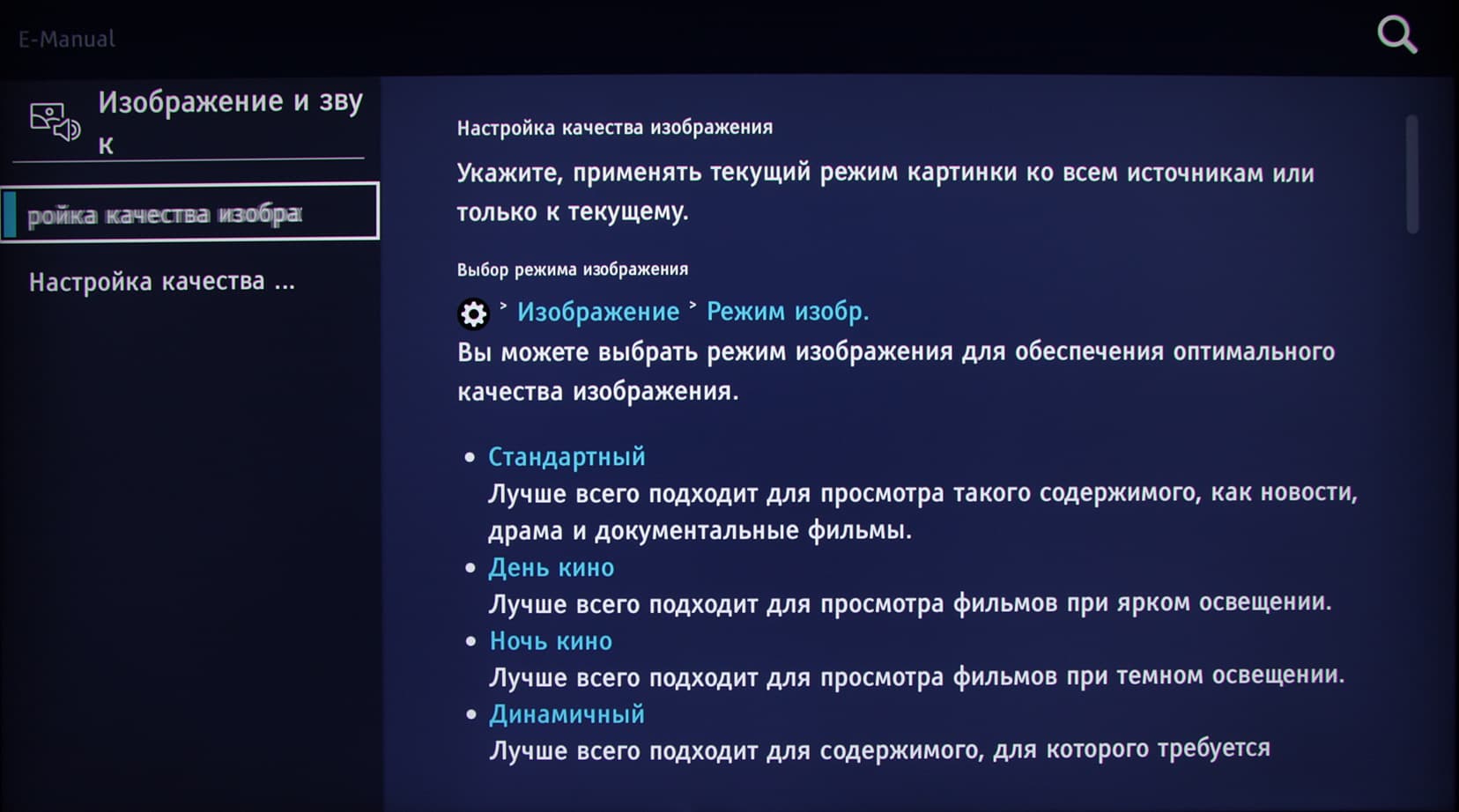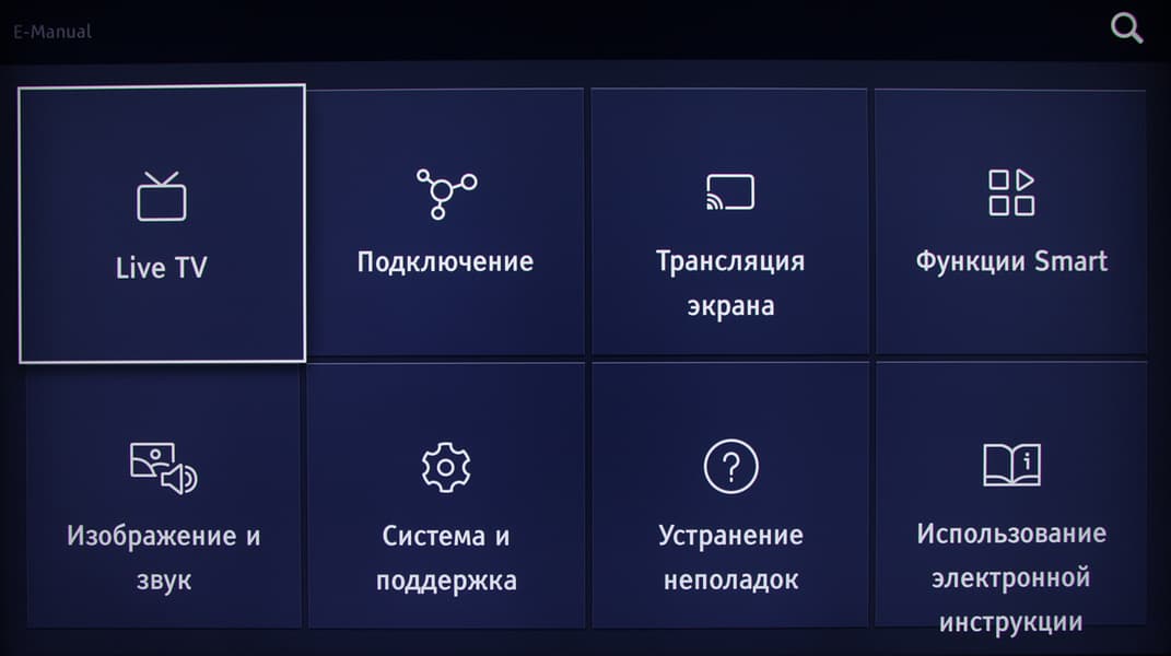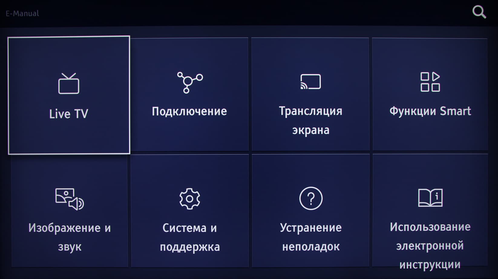 К телевизору прилагается малоинформативное напечатанное руководство пользователя. Больше информации содержится во встроенной справке E-Manual: