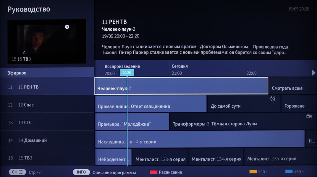 Есть хорошая поддержка электронной программы передач — можно посмотреть, что именно идет на текущем и других каналах, запрограммировать просмотр или запись программы или сериала и т. д.