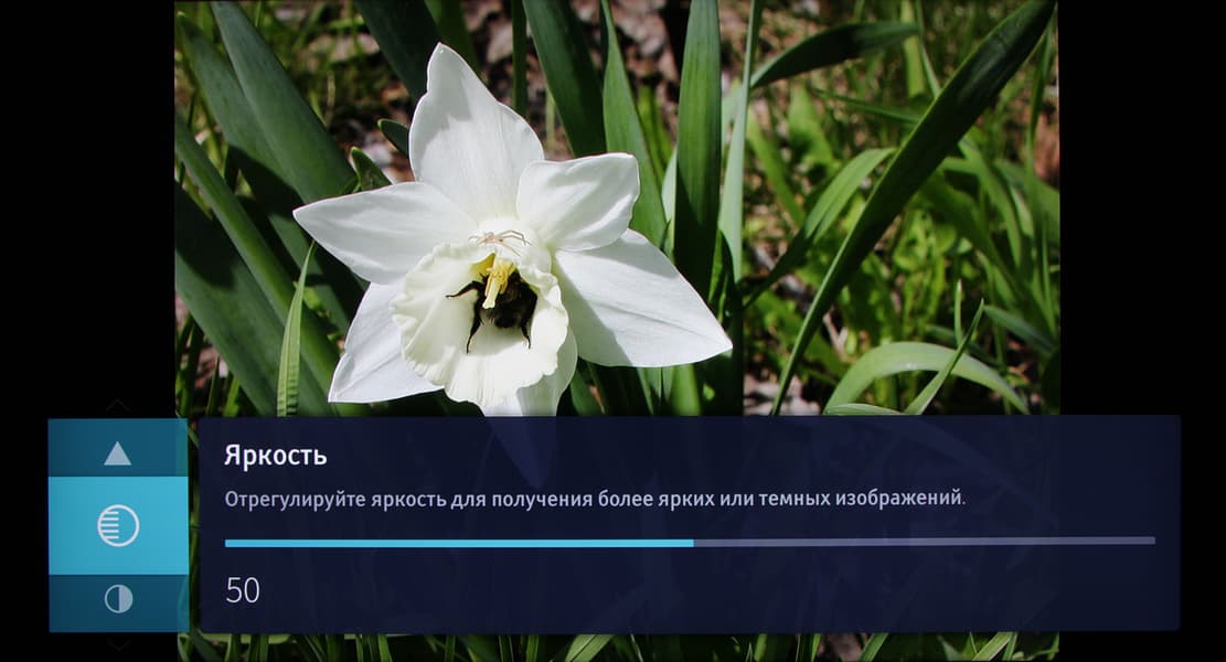 Отметим, что в целом к стабильности работы оболочки у нас никаких претензий не возникло. На команды с пульта ТВ реагирует практически без задержки, разве что страница со списком настроек изображения выводится с ощутимой задержкой, видимо, слишком много в ней пунктов меню. Удобно, что есть отдельные кнопки возврата на предыдущий уровень меню и быстрого выхода из меню вообще. Меню с настройками ТВ занимает большую часть экрана, надписи в нем читаемые. Есть русифицированный вариант интерфейса. Качество перевода хорошее, и самое главное, что настройки в большинстве случаев меняют именно то, что ожидаешь, исходя из их наименования. Непосредственно при регулировке параметров изображения на экран выводится уже только название настройки, ползунок и текущее значение или список вариантов, что облегчает оценку влияния этой настройки на изображение, при этом настройки с ползунками перебираются стрелками вверх и вниз.