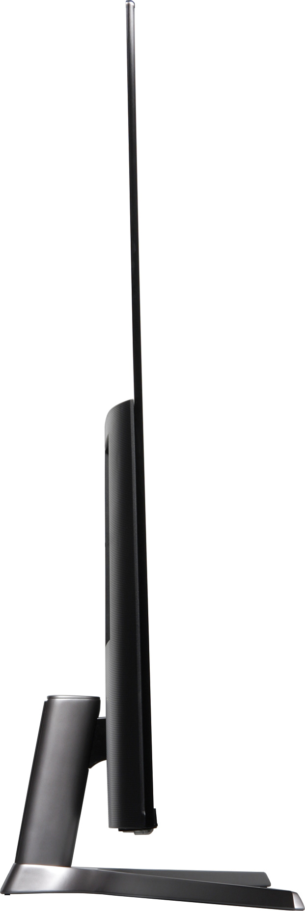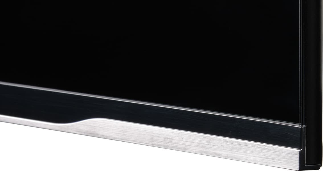 Дизайн строгий. Экран с трех сторон не имеет рамок, в том смысле, что на его монолитной плоскости по бокам и сверху нет накладных элементов, есть только узкое обрамление из алюминиевого профиля. По бокам профиль анодирован и имеет черное матовое покрытие, сверху профиль просто анодирован и матово-блестящий. Верхний профиль может отсвечивать, но он очень узкий, поэтому в любом случае просмотру не мешает. Снизу спереди на экране есть неширокая накладка из черного пластика с зеркально-гладкой поверхностью. По низу этой накладки идет узкая серебристая полоска, которая уширяется к правому углу.