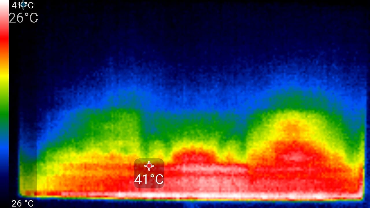 Видно, что основным источником тепла является светодиодная линейка по нижнему краю экрана. Максимальный нагрев локальных участков спереди составил 42 °C.
