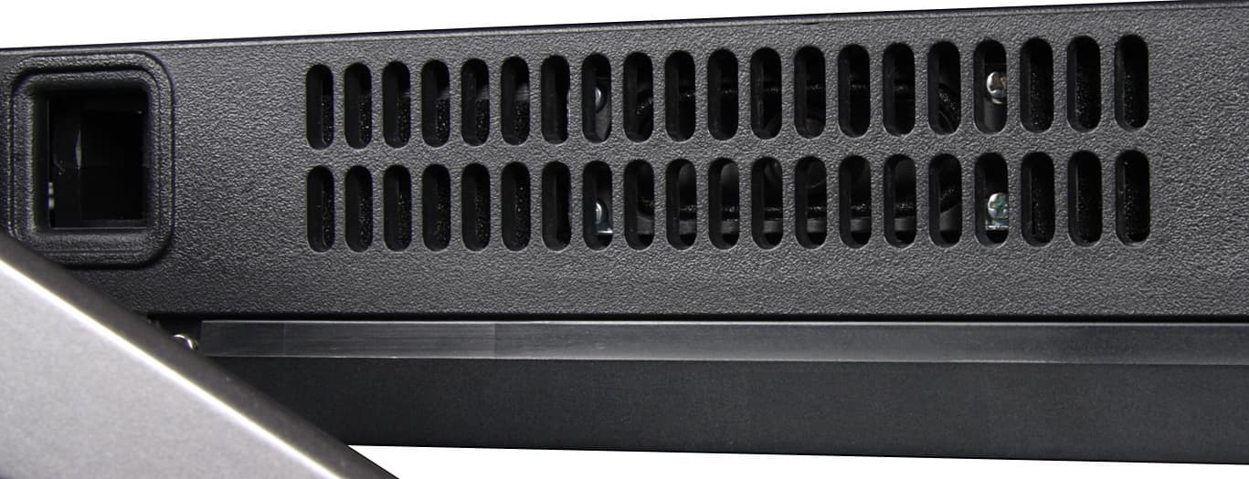 На нижнем и верхнем торцах кожуха есть вентиляционные решетки. За решетками на нижнем торце можно рассмотреть два средне-высокочастотных громкоговорителя с вытянутыми диффузорами, а рядом – отверстия фазоинверторов.
