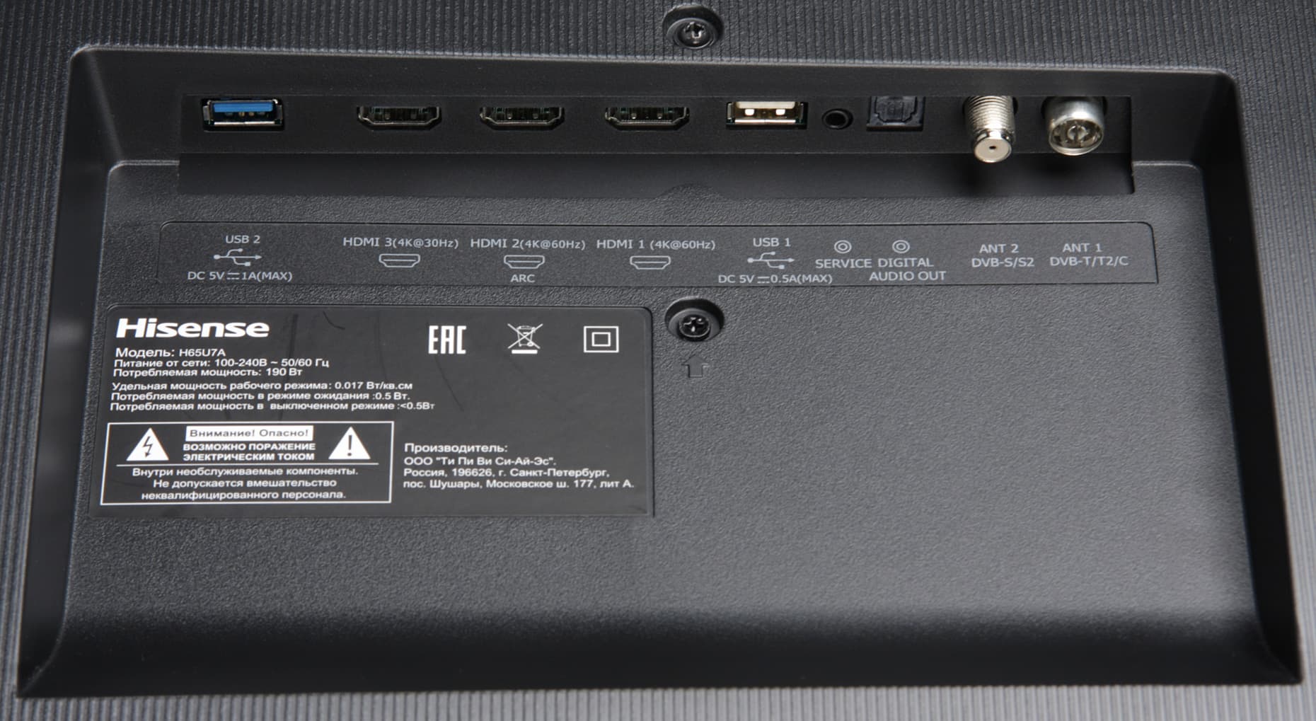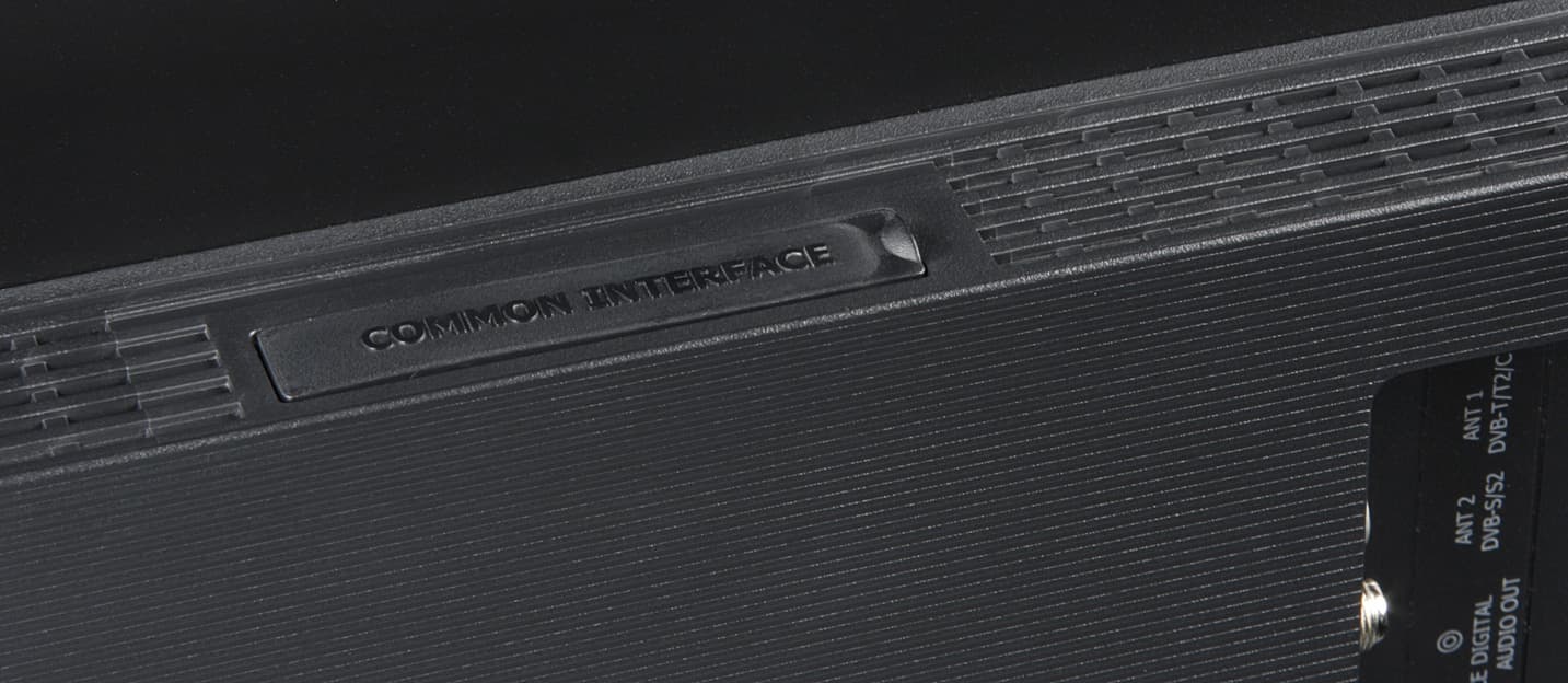 Разъемы размещены в трех нишах на задней панели. Часть разъемов направлена назад, часть вбок. Гнездо для модуля CI+ находится на верхнем торце кожуха и прикрыто заглушкой. Кабель питания можно пропустить до стойки и уложить его в канал сверху вниз.