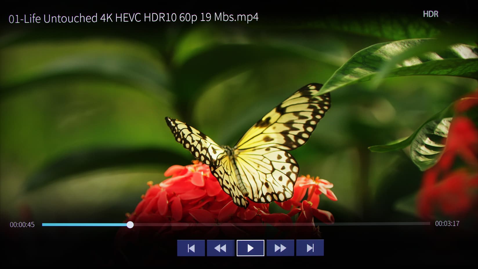 Для видеофайлов поддерживается большое количество самых разнообразных контейнеров и кодеков (вплоть до H.265 с 10 бит, HDR10 или HLG, с разрешением до UHD при 60 кадр/с), несколько звуковых дорожек в разнообразных форматах (AAC, AC3, DTS), внешние и встроенные субтитры (русские должны быть в кодировке Windows-1251 или в Unicode, выводится две строки максимум).