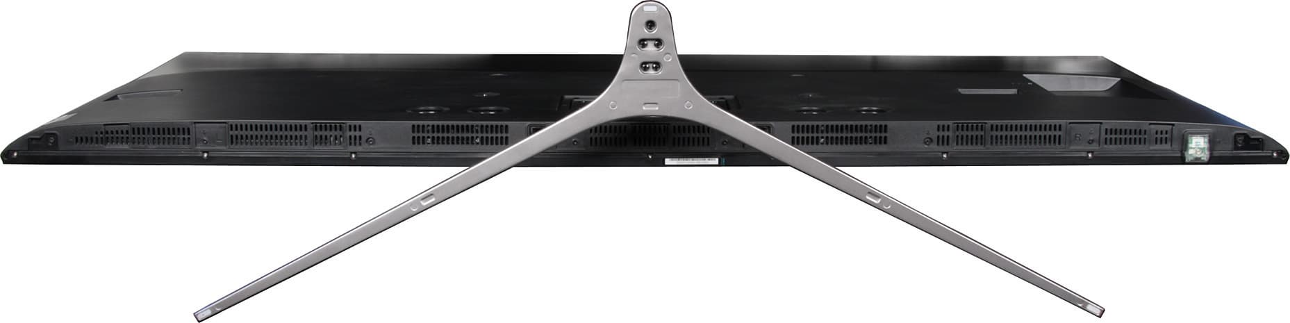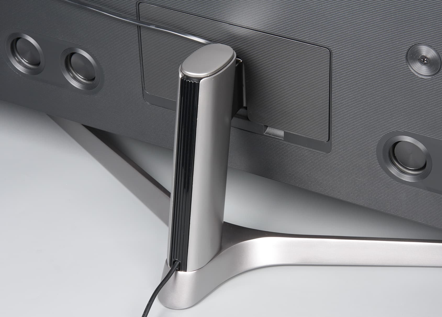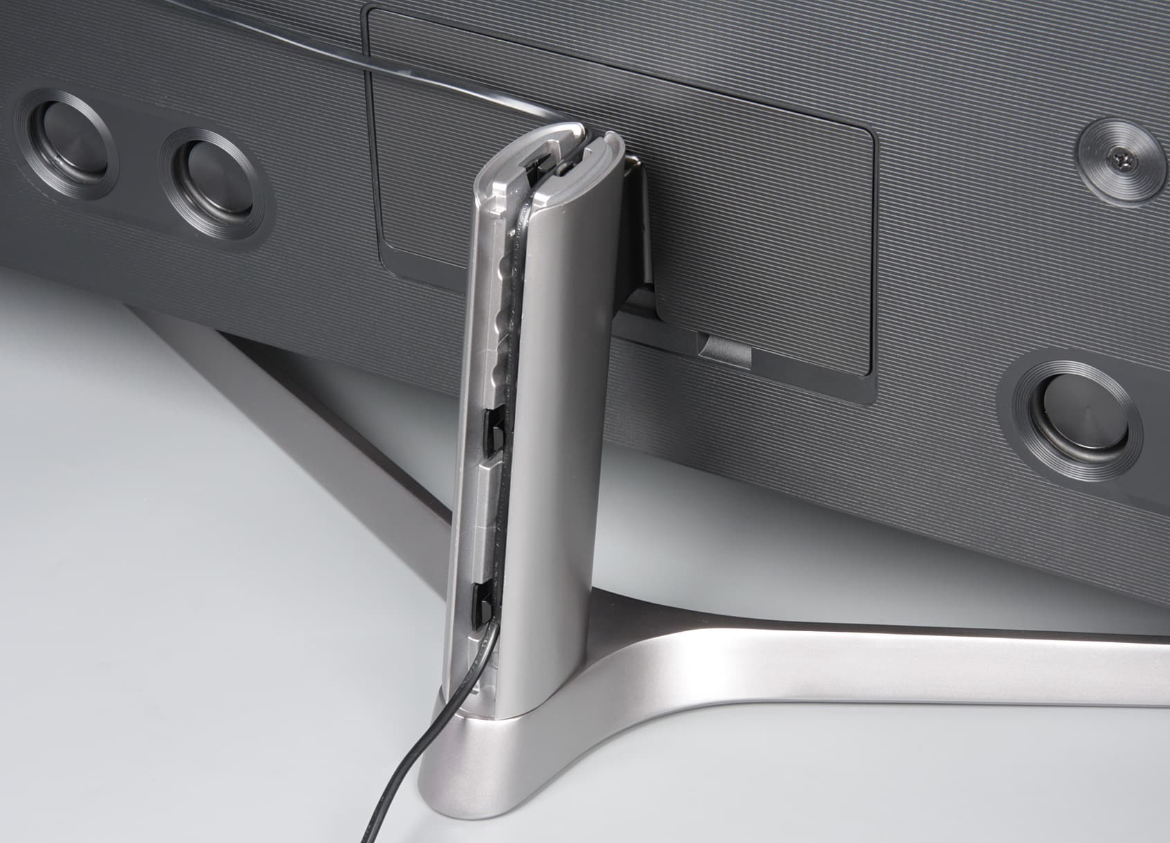 Обе детали изготовлены из алюминиевого сплава и имеют стойкое серебристое покрытие. Опирается основание на три противоскользящие накладки из упругого пластика. Жесткость конструкции высокая, телевизор стоит устойчиво с небольшим наклоном назад.