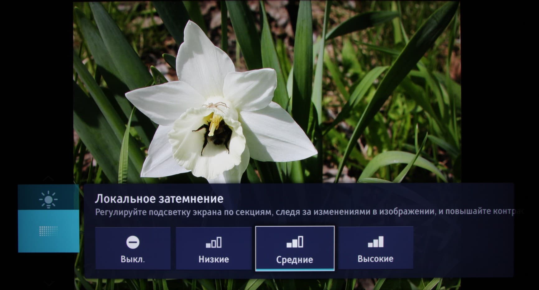 Но по факту из-за высокой контрастности на это обращаешь внимание только при выводе черного поля во весь экран в полной темноте и после адаптации глаз, на реальных изображениях и в домашней обстановке неравномерность засветки черного увидеть практически невозможно. К тому же по умолчанию работает зональная динамическая подстройка яркости подсветки — на темных в среднем изображениях яркость понижается, — это еще больше снижает заметность неравномерной засветки черного поля.