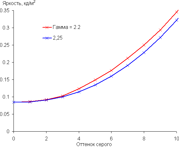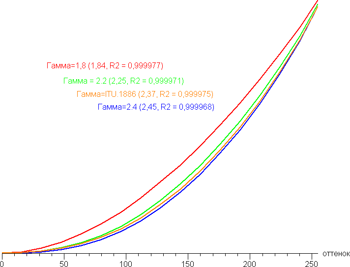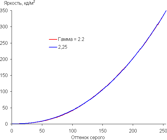 Аппроксимация полученной гамма-кривой дала показатель 2,25, что немного выше стандартного значения 2,2, при этом реальная гамма-кривая мало отклоняется от аппроксимирующей степенной функции (при Контраст = 45):