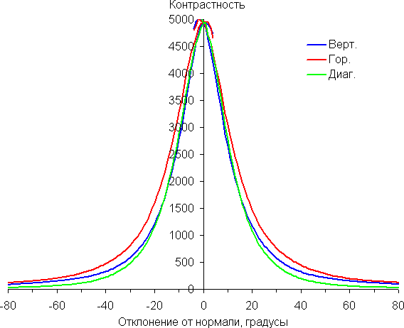 Отметим относительно плавное уменьшение яркости при отклонении от перпендикуляра к экрану во всех трех направлениях, при этом графики яркости полутонов не пересекаются во всем диапазоне измеряемых углов. Яркость черного поля при отклонении от перпендикуляра к экрану возрастает, и при диагональном и вертикальном отклонении возрастает больше, но всего до примерно 0,3% от максимальной яркости белого поля и только при очень большом отклонении (примерно при 65°). Это хороший результат. Контрастность в диапазоне углов ±82° для двух направлений значительно превышает 10:1 и только для диагонального направления она ниже и по одной диагонали опускается за отметку 10:1 при 58°.