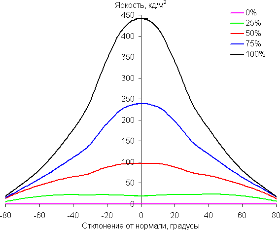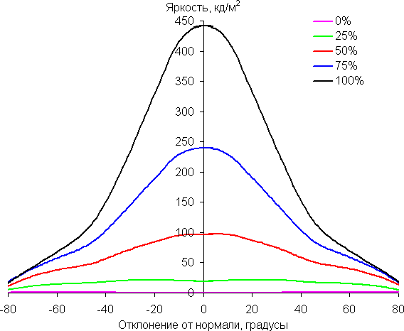 В качестве реперной точки можно выбрать отклонение в 45°. Критерием сохранения правильности цветов можно считать значение ΔE меньше 3. Из графиков следует, что при взгляде под углом хотя бы основные цвета меняются несильно, но полутона существенно изменяются, что ожидаемо для матрицы типа VA* и является ее основным недостатком.