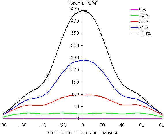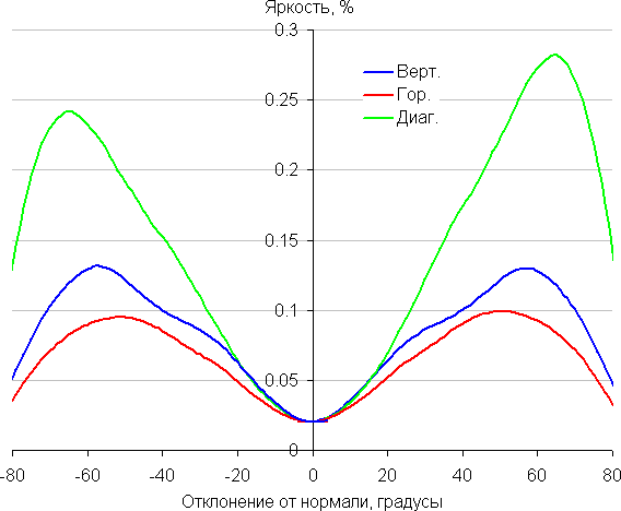 Чтобы выяснить, как меняется яркость экрана при отклонении от перпендикуляра к экрану, мы провели серию измерений яркости белого в центре экрана в широком диапазоне углов, отклоняя ось датчика в вертикальном, горизонтальном и диагональном (из угла в угол) направлениях.