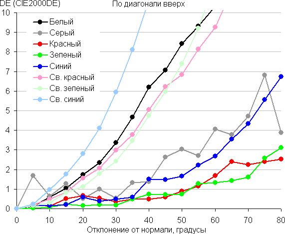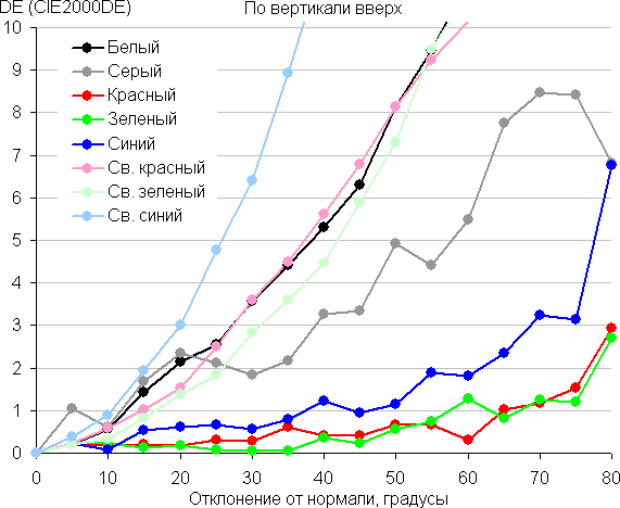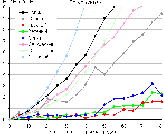 Для количественной характеристики изменения цветопередачи мы провели колориметрические измерения для белого, серого (127, 127, 127), красного, зеленого и синего, а также светло-красного, светло-зеленого и светло-синего полей во весь экран с использованием установки, подобной той, что применялась в предыдущем тесте. Измерения проводились в диапазоне углов от 0° (датчик направлен перпендикулярно к экрану) до 80° с шагом в 5°. Полученные значения интенсивностей были пересчитаны в отклонение ΔE относительно замера каждого поля при перпендикулярном положении датчика относительно экрана. Результаты представлены ниже: