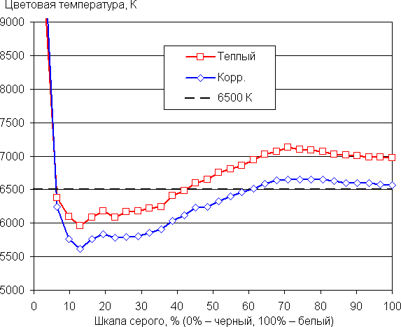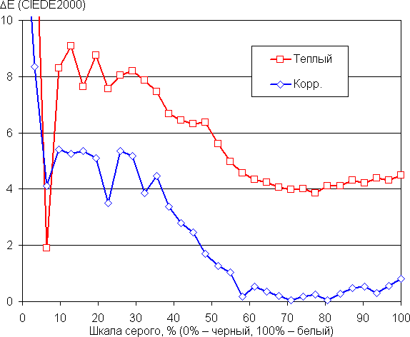 Графики ниже показывают цветовую температуру на различных участках шкалы серого и отклонение от спектра абсолютно черного тела (параметр ΔE) для профиля Динамичный с вариантом Теплый для настройки Цветовой тон и после коррекции цветового баланса регулировками усиления трех основных цветов: