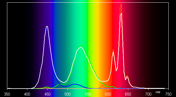 Ниже приведен спектр для белого поля (белая линия), наложенный на спектры красного, зеленого и синего полей (линии соответствующих цветов) для профиля Нативный: