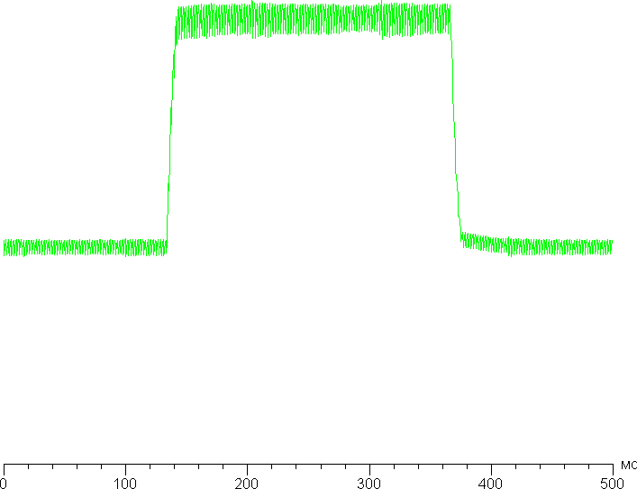 Время отклика при переходе черный-белый-черный равно 15,2 мс (9,0 мс вкл. + 6,2 мс выкл.). Переходы между полутонами происходят в среднем за 13,3 мс в сумме. Выраженного «разгона» матрицы нет. Приведем примеры зависимости яркости (вертикальная ось) от времени (горизонтальная ось) для перехода между уровнями яркости 40%—60% в процентах от численного значения оттенка серого: