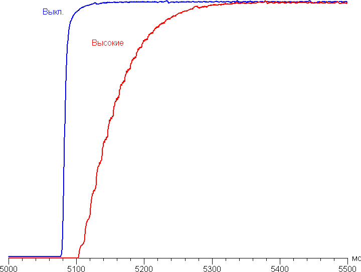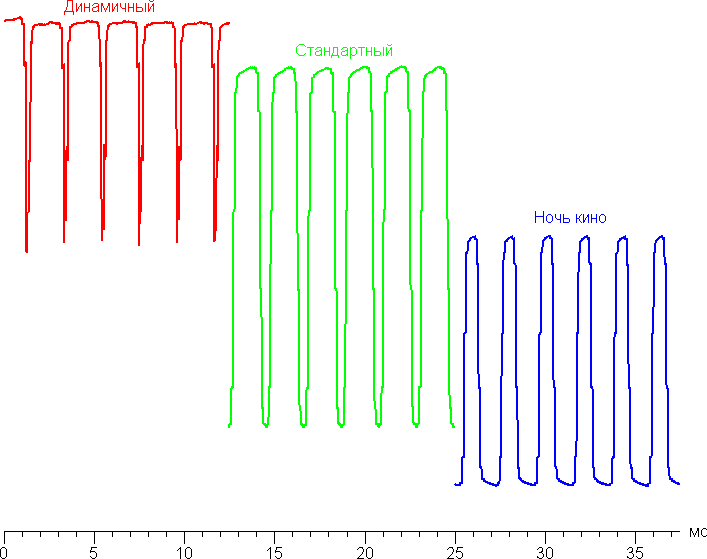 При включенном режиме с динамическим управлением яркости установившаяся контрастность формально возрастает до бесконечности, так как на черном поле во весь экран подсветка выключается совсем. График ниже показывает, как увеличивается яркость (вертикальная ось) при переключении с черного поля (после пяти секунд вывода) на белое при выключенной и включенной динамической подстройке яркости (для наглядности зависимости сглажены):