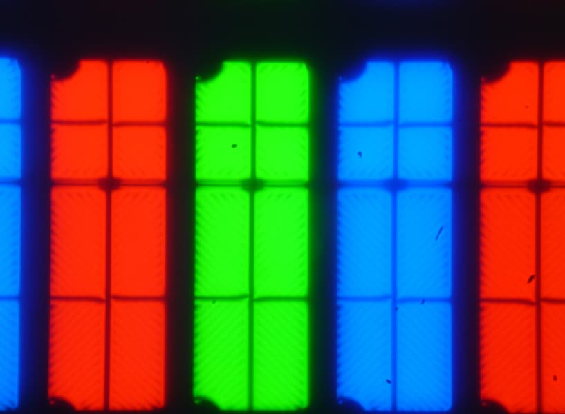 Выявленные характеристики экрана позволяют предположить, что в данном телевизоре установлена матрица типа *VA. Микрофотографии не противоречат этому (черные точки — это пыль на матрице фотоаппарата):