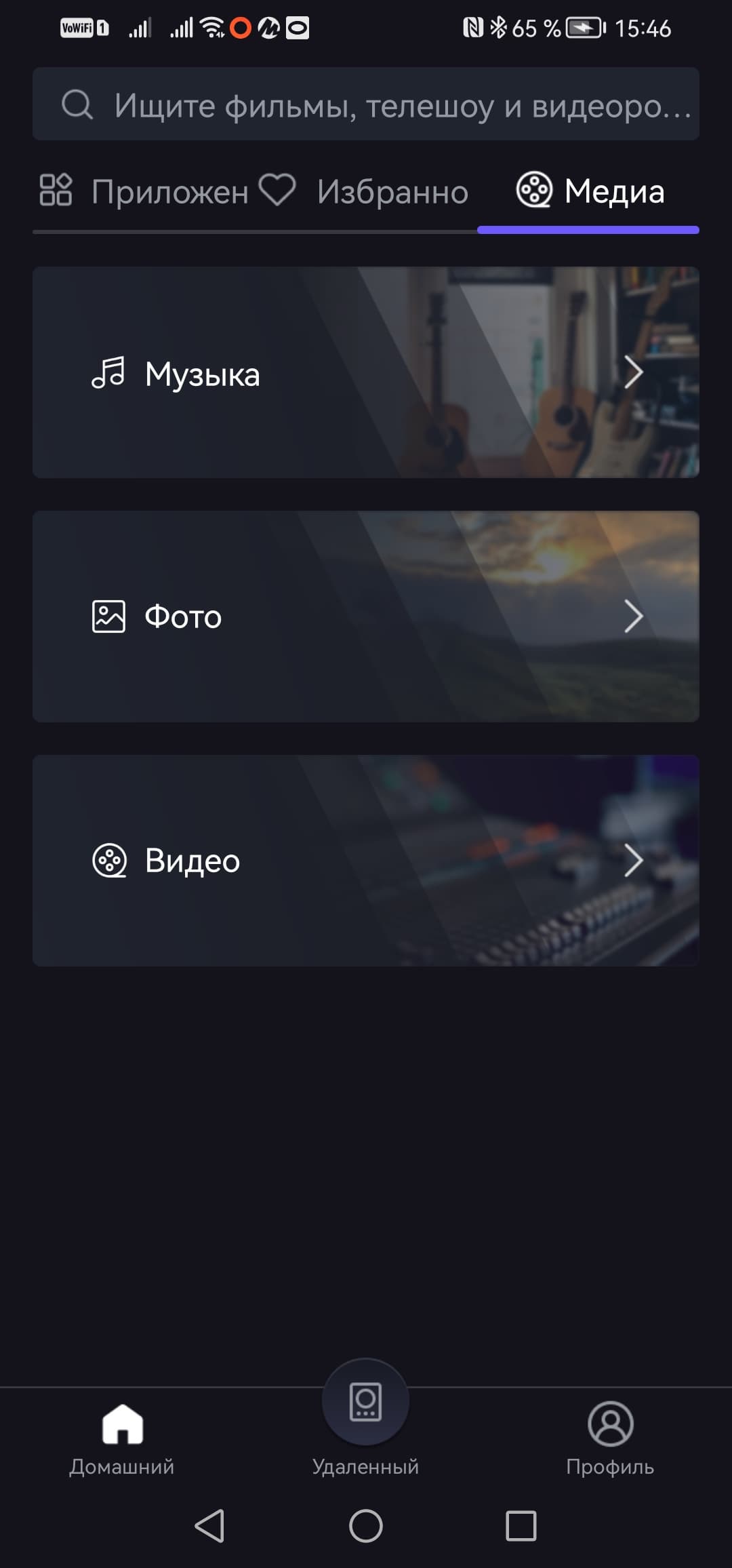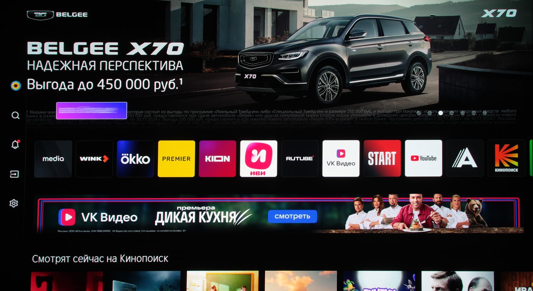 Программной платформой для этого проектора служит операционная система, основанная на ядре Linux. Применяется пользовательская оболочка Vidaa U7.6. Заглавная страница интерфейса типична для современных умных проекторов. Слева по вертикали выстроились значки настроек профиля пользователя, поиска, уведомлений, выбора источника и входа в меню с настройками. Присутствует горизонтальная лента из квадратных значков установленных приложений. Эти значки можно перемещать по ленте, чтобы, например, часто используемые были в начале. Основную же площадь страницы занимают рекламные баннеры и обложки рекомендуемого контента.