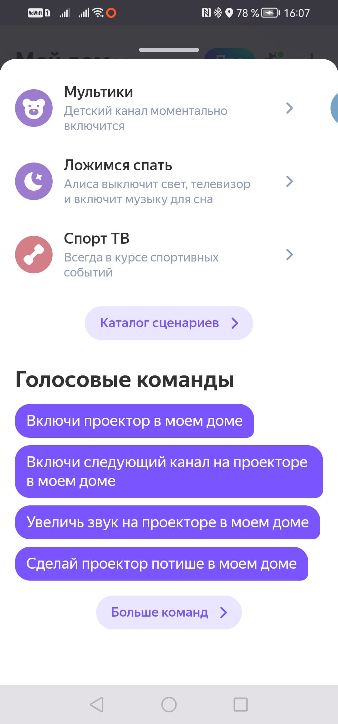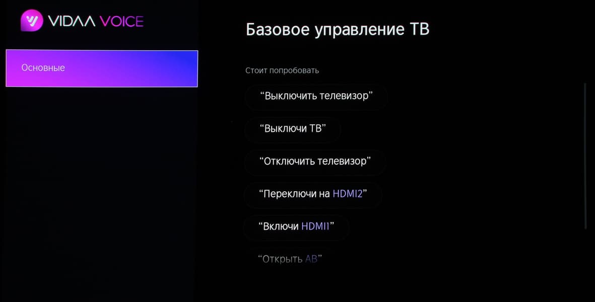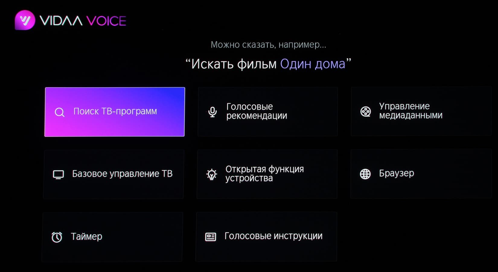 В ряде программ работает голосовой ввод текста. Также есть базовая интеграция с самим проектором, например, голосом можно менять громкость, выключать/включать звук и выключать сам проектор, переходить на главный экран, открывать меню с настройками, выбирать нужный вход и запускать программу по ее названию. По запросу «Что ты умеешь?» на экран выводится список категорий с примерами команд и запросов, которые понимает голосовой помощник.