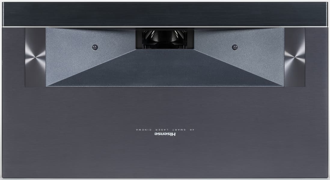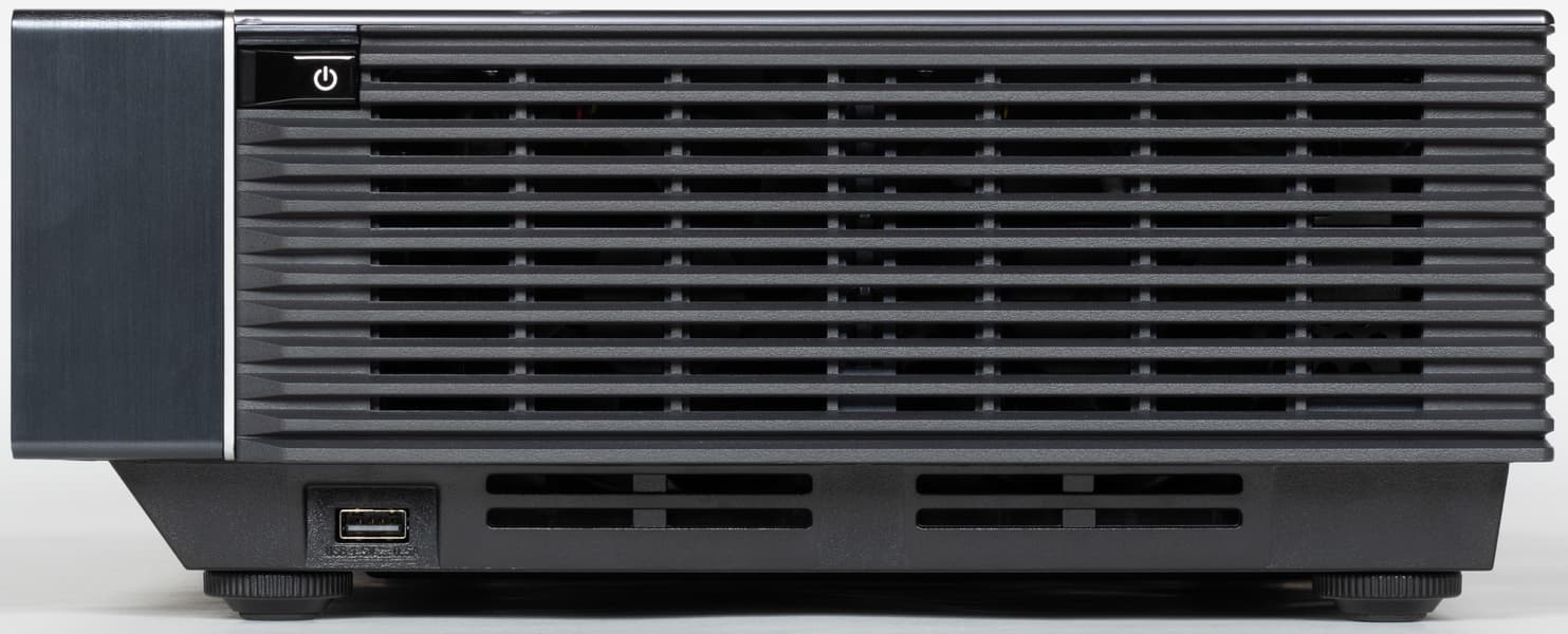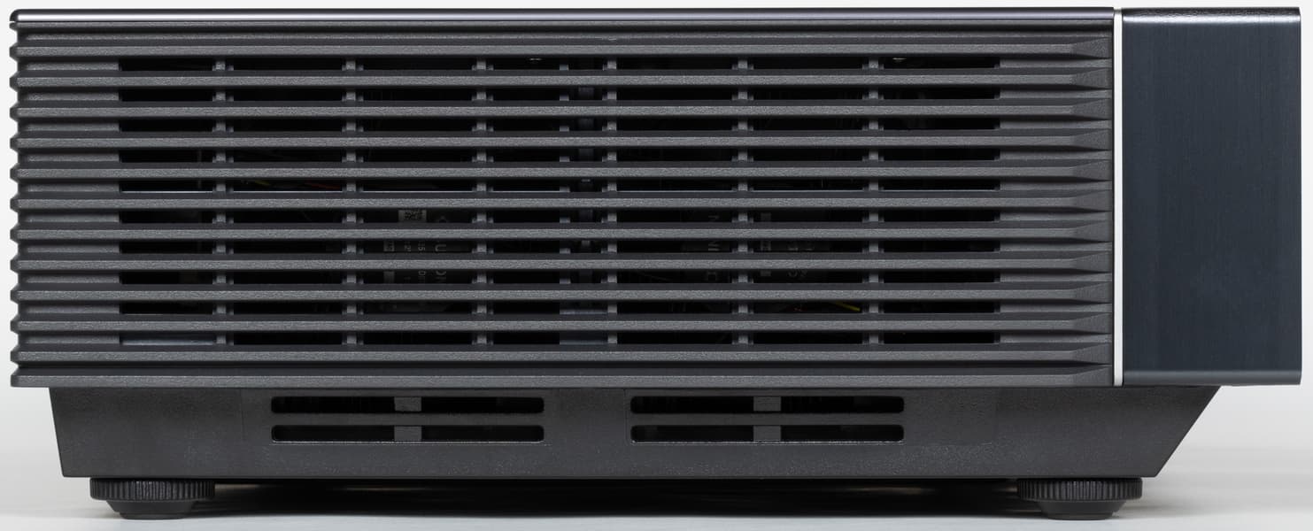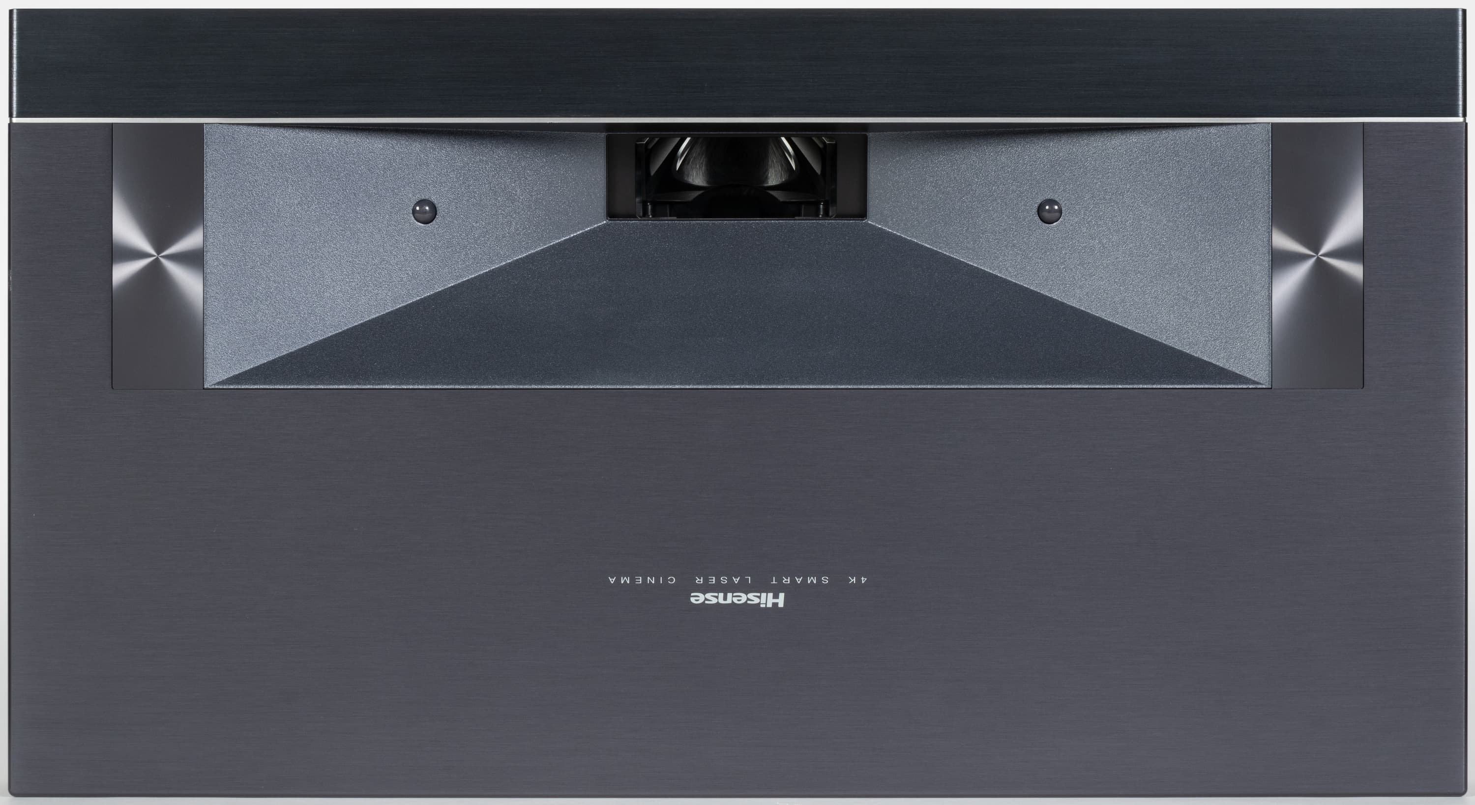 Из такого же материала изготовлен корпус встроенного саундбара, расположенного в задней, обращенной к зрителю части проектора. Отражатели высокочастотных громкоговорителей, расположенные по краям саундбара, подсвечиваются индикаторами состояния, которые неярко светятся белым в режиме ожидания (можно отключить в меню настроек), мигают белым при включении проектора и не горят во время работы.