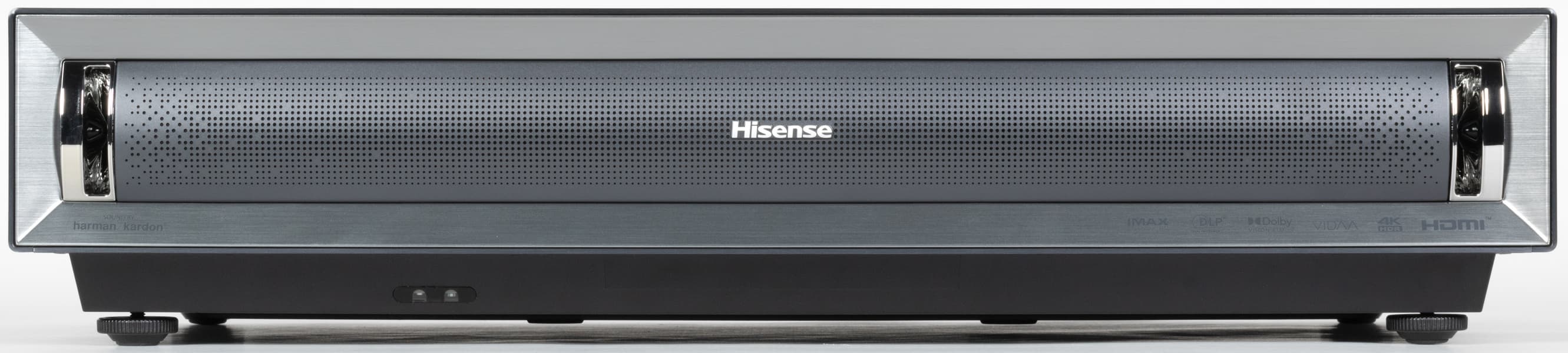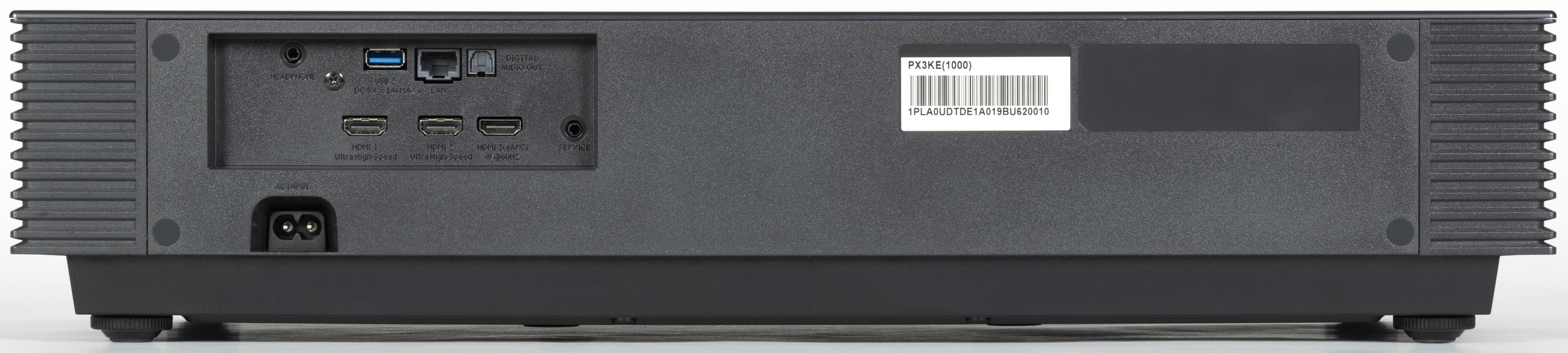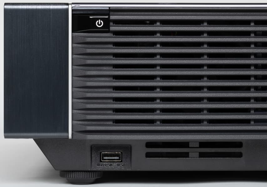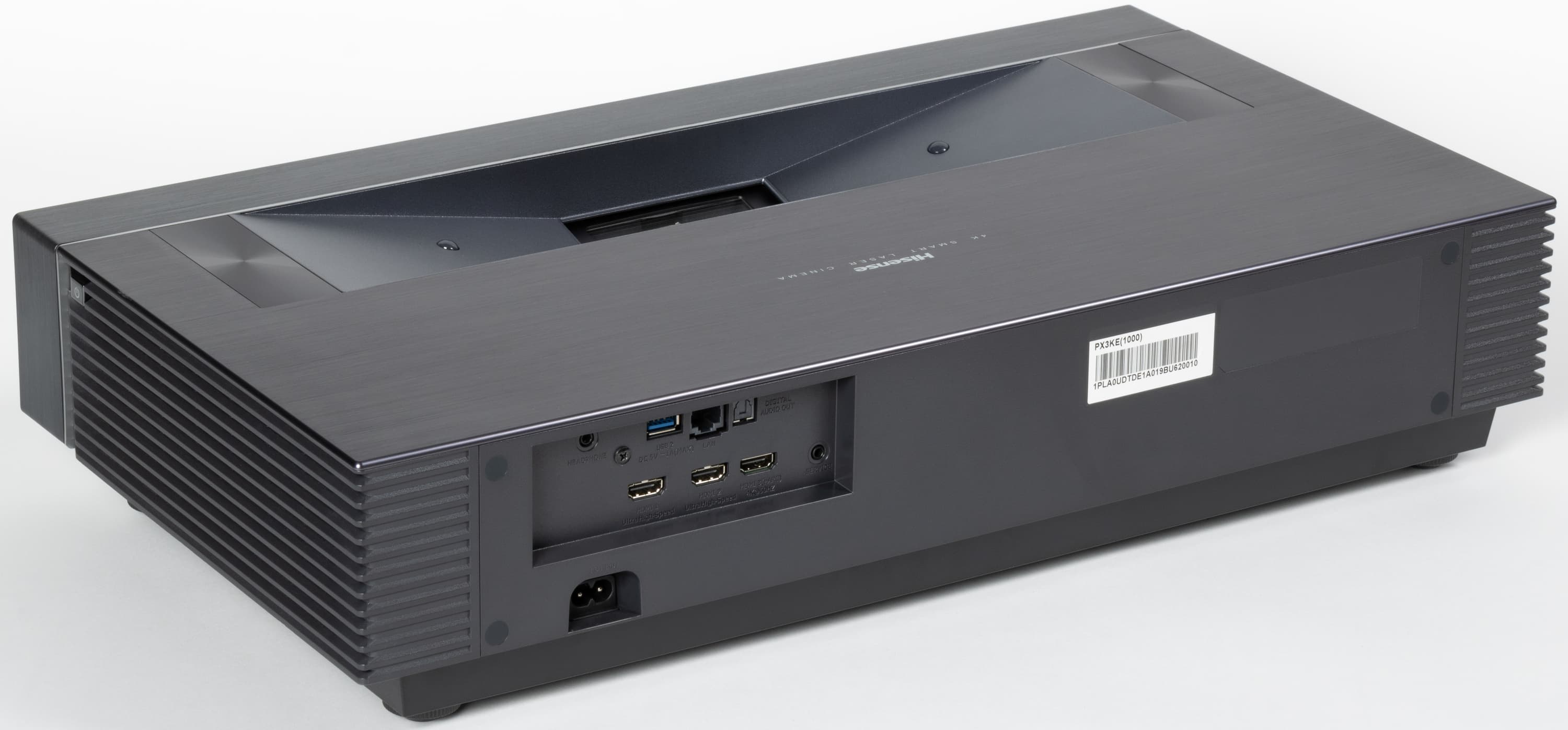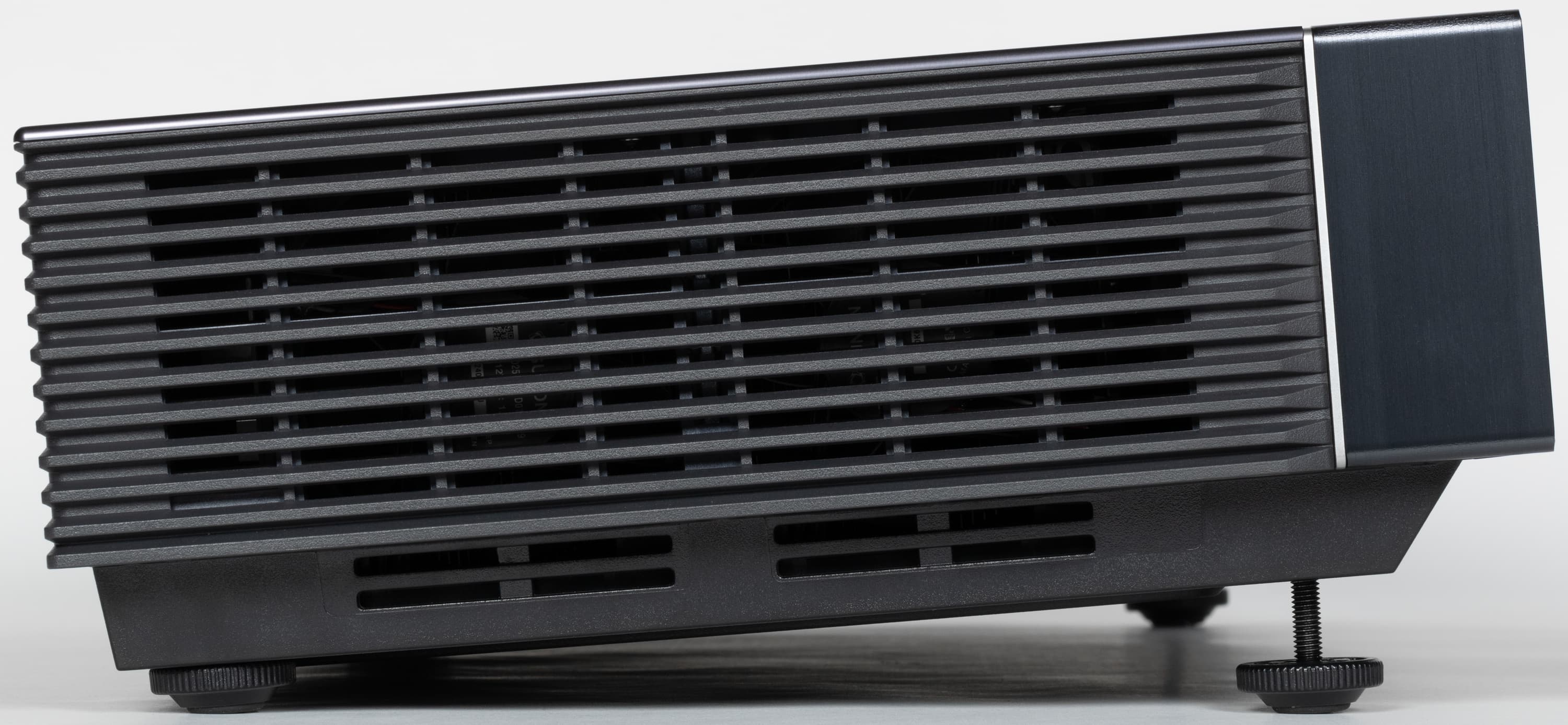 Из такого же материала изготовлен корпус встроенного саундбара, расположенного в задней, обращенной к зрителю части проектора. Отражатели высокочастотных громкоговорителей, расположенные по краям саундбара, подсвечиваются индикаторами состояния, которые неярко светятся белым в режиме ожидания (можно отключить в меню настроек), мигают белым при включении проектора и не горят во время работы.
