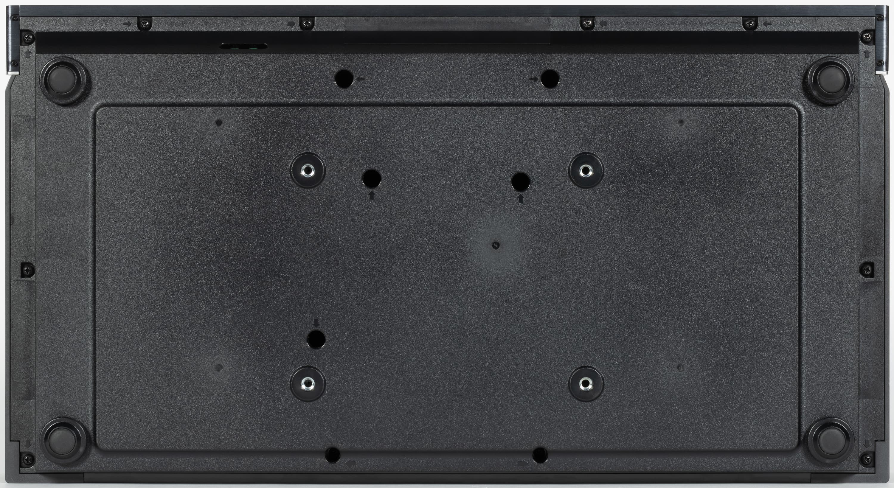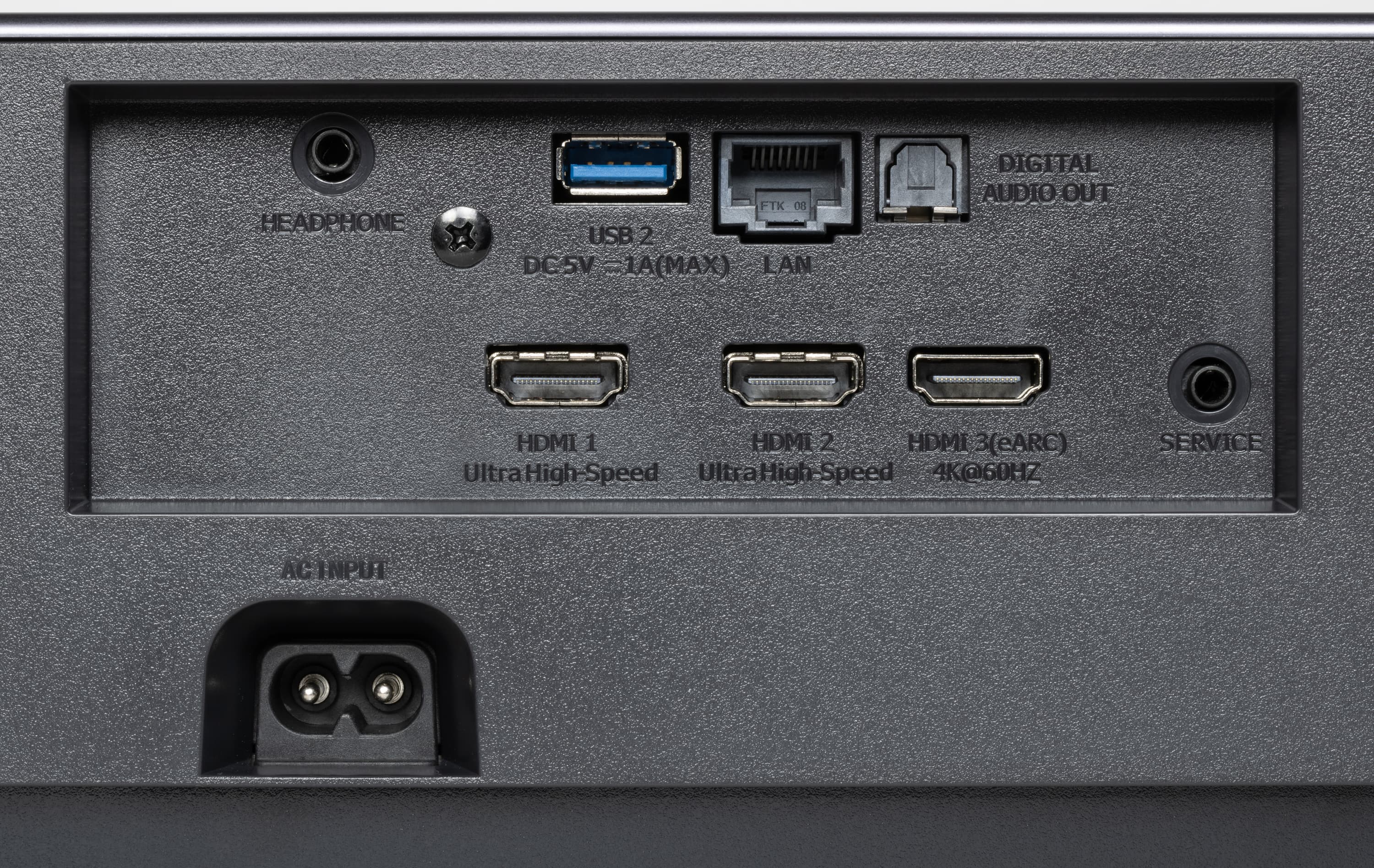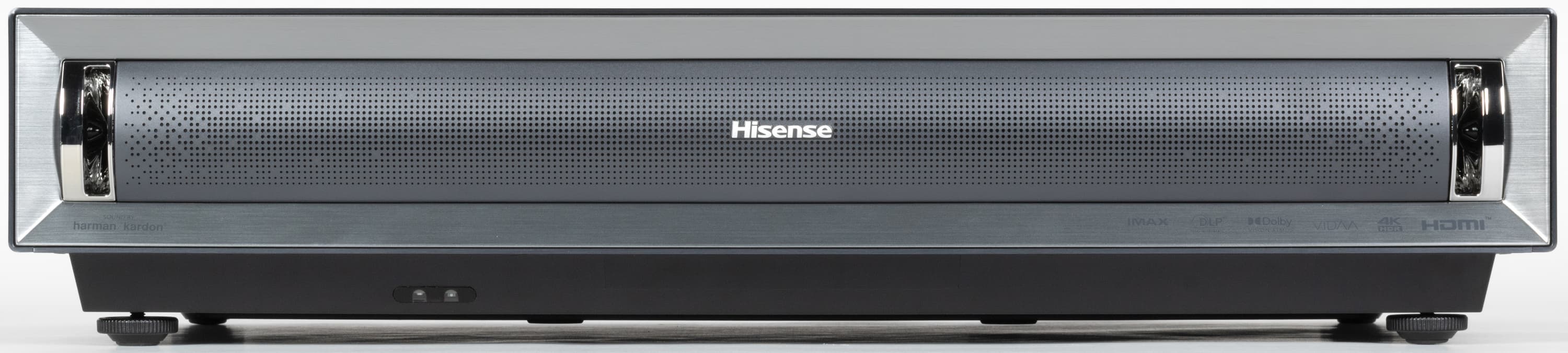 Из такого же материала изготовлен корпус встроенного саундбара, расположенного в задней, обращенной к зрителю части проектора. Отражатели высокочастотных громкоговорителей, расположенные по краям саундбара, подсвечиваются индикаторами состояния, которые неярко светятся белым в режиме ожидания (можно отключить в меню настроек), мигают белым при включении проектора и не горят во время работы.