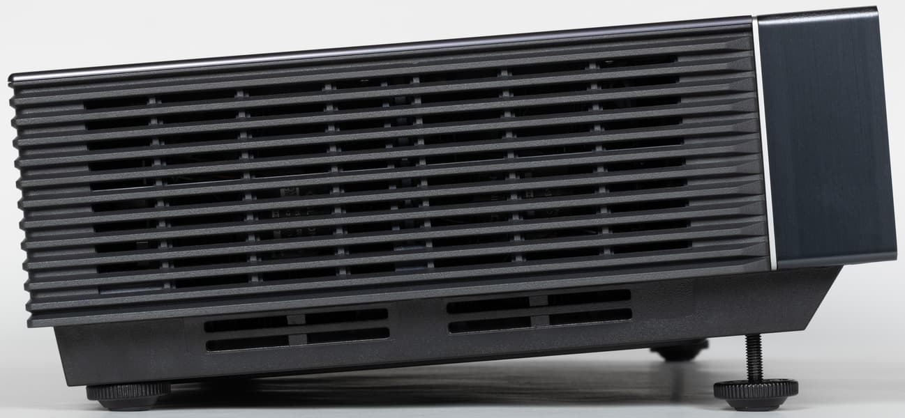 Дизайн строгий. Декоративные элементы в явном виде отсутствуют. Корпус проектора в основном изготовлен из пластика с полуматовой черной или темно-темно-серой поверхностью. На верхней панели есть накладка из алюминиевого сплава с анодированной поверхностью.